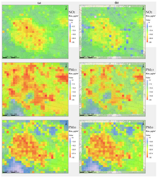 Maps with calculated deviations between the modelled annual concentrations for 2018 and EXPANSE data of NO2, PM10 and PM2.5; CMAQ model (a) and MAQS system (b).