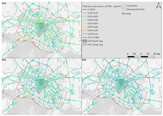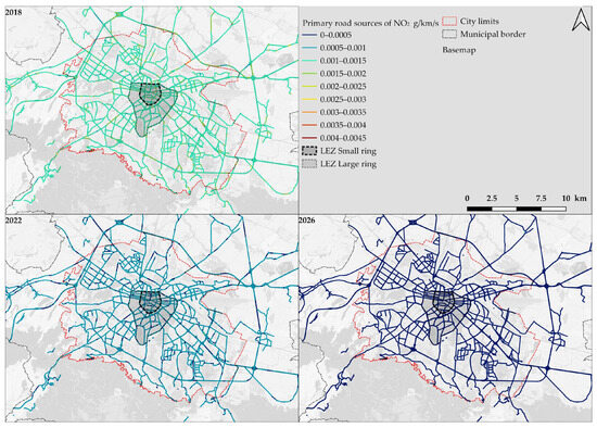 The emission inventory formed the basis for the baseline and several future scenarios in Sofia. These scenarios, modelled using EMIT, differ in terms of time frame (2018–2022–2026) and inclusion in LEZ zones (small ring, large ring, rest of the city), taking into account the provisions for heavy-traffic access to the city within the three other zones different from the LEZ (Centre zone, Zone 1, and the rest of the city). Overall, one baseline with three distributions of heavy goods’ fleet traffic, as well as two scenarios differentiated into sub-zones according to the scope of the LEZ (the whole city for 2022, as well as the small and large rings and the rest of the city for 2026) and the corresponding access regulations for heavy goods’ traffic, which stay in place, were subsequently used as combined annual input data to simulate pollutant concentrations (PM10, PM2.5, NOx, NO2) for the years 2018, 2022, and 2026.