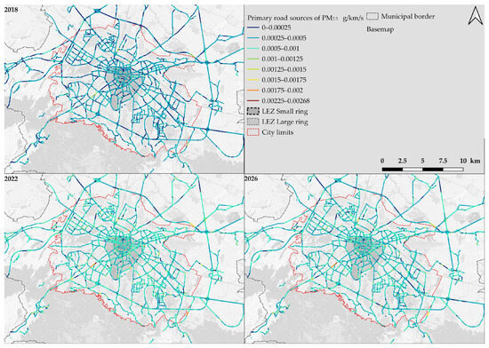 Maps with calculated average concentrations for the months of LEZ operation are shown in Figure 8, Figure 9 and Figure 10. The implementation of the LEZ leads to a significant reduction in NO2 concentrations, especially in the 2026 scenario (Figure 8). The reduction is up to 30 μg/m3 on major boulevards with heavy traffic. Changes in PM2.5 and PM10 concentrations are not significant, as emissions from transport are lower than those from other sources (Figure 9 and Figure 10). The largest reductions in concentrations are on busy streets and at intersections where traffic is heavier.