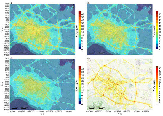 EXPANSE mapped the mean annual concentrations of NO2, PM2.5, PM10, and O3 Europe-wide for each year from 2000 to 2019 [51]. The maps are available in raster format with an original resolution of 25 × 25 m and aggregated to 100 × 100 m or 1 × 1 km. Unlike our dispersion modelling approach, EXPANSE used a stochastic approach, developing land use regression models (LUR) that provided highly granular exposure surfaces suitable for environmental health research [6]. These LUR models were developed using a geographically weighted regression of measured air pollutants at monitoring stations across Europe against a predictor set that included GIS indicators of land use and road infrastructure, and measured pollutant levels from spectral analysis of satellite imagery and chemical transport model data. Five-fold cross-validation of the models for individual pollutants derived R2 values of 0.66 for NO2, 0.77 for PM2.5, 0.62 for PM10, and 0.58 for O3 [51].