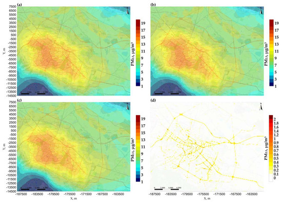 Maps with calculated average concentrations (for December, January, February) of PM2.5 for 2018 (a), small ring 2022 (b), large ring 2026 (c) and differences between concentrations for the base year 2018 and the large ring 2026 scenarios (d).
