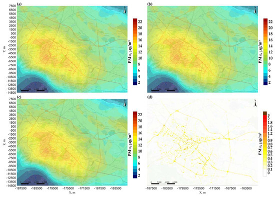 Maps with calculated average concentrations (for December, January, February) of PM10 for 2018 (a), small ring 2022 (b), large ring 2026 (c) and differences between concentrations for the base year 2018 and the large ring 2026 scenarios (d).