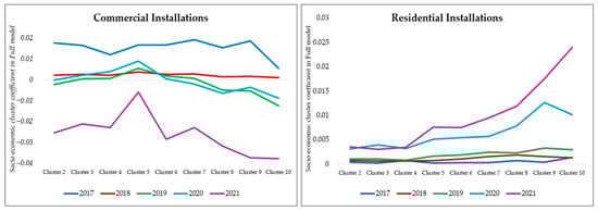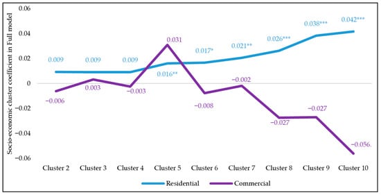 | Socio-economic cluster #10 | 0.0055 (0.0091) | 0.0010 (0.0036) | −0.0124 (0.0076) | −0.0089 (0.0088) | −0.0377 * (0.0156) |
