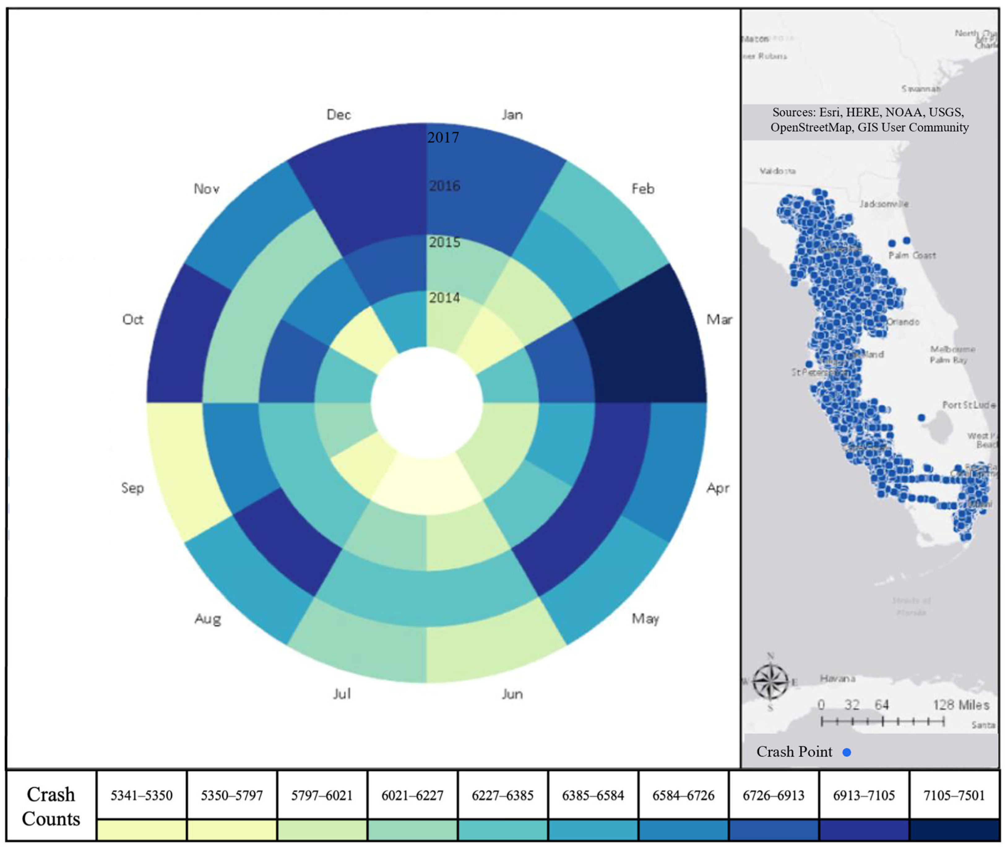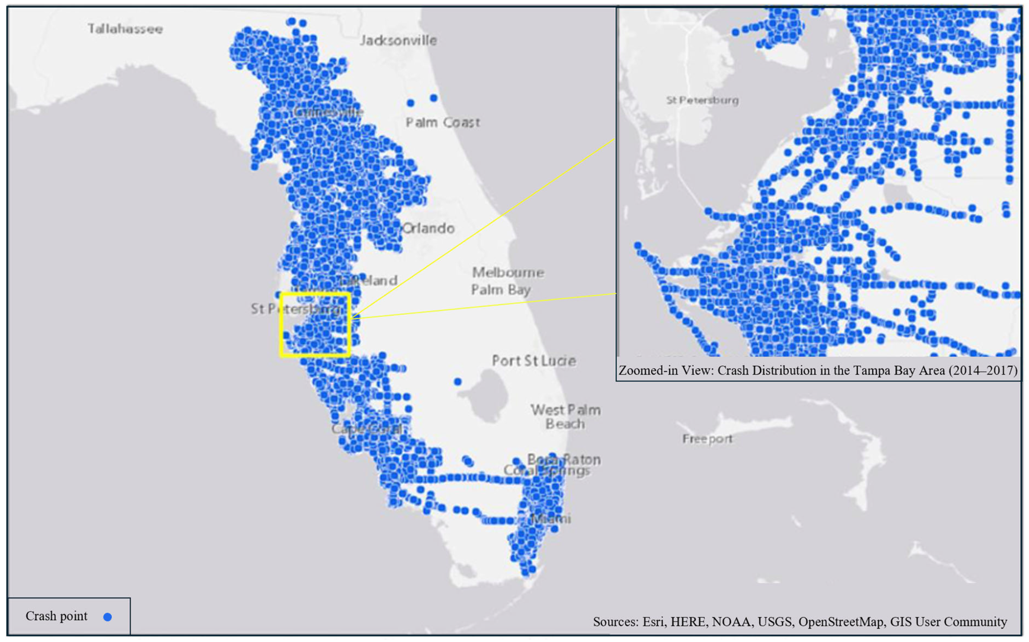- Vemulapalli, S.S.; Ulak, M.B.; Ozguven, E.E.; Sando, T.; Horner, M.W.; Abdelrazig, Y.; Moses, R. GIS-based Spatial and Temporal Analysis of Aging-Involved Accidents: A Case Study of Three Counties in Florida. Appl. Spat. Anal. Policy 2017, 10, 537–563. [Google Scholar] [CrossRef]