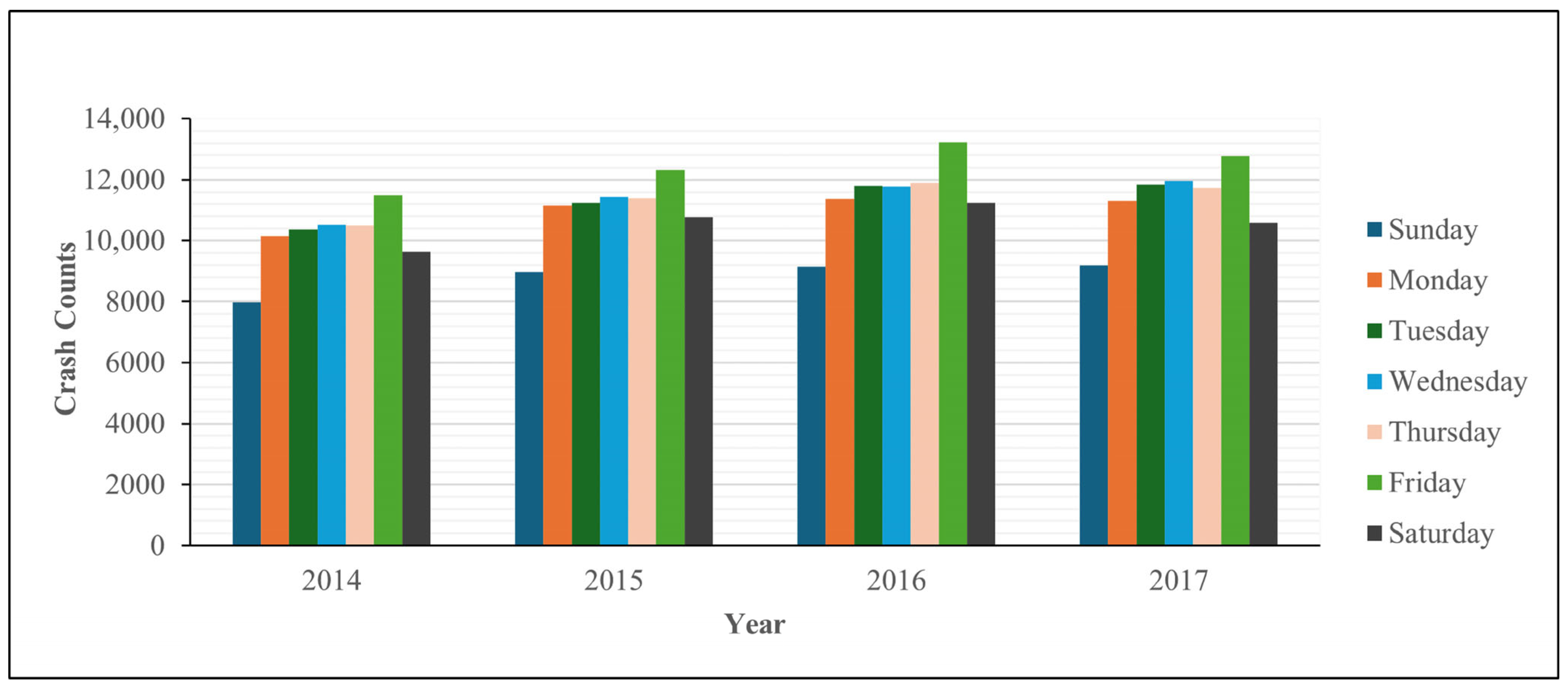 - Li, L.; Zhu, L.; Sui, D.Z. A GIS-based Bayesian approach for analyzing spatial-temporal patterns of intra-city motor vehicle crashes. J. Transp. Geogr. 2007, 15, 274–285. [Google Scholar] [CrossRef]