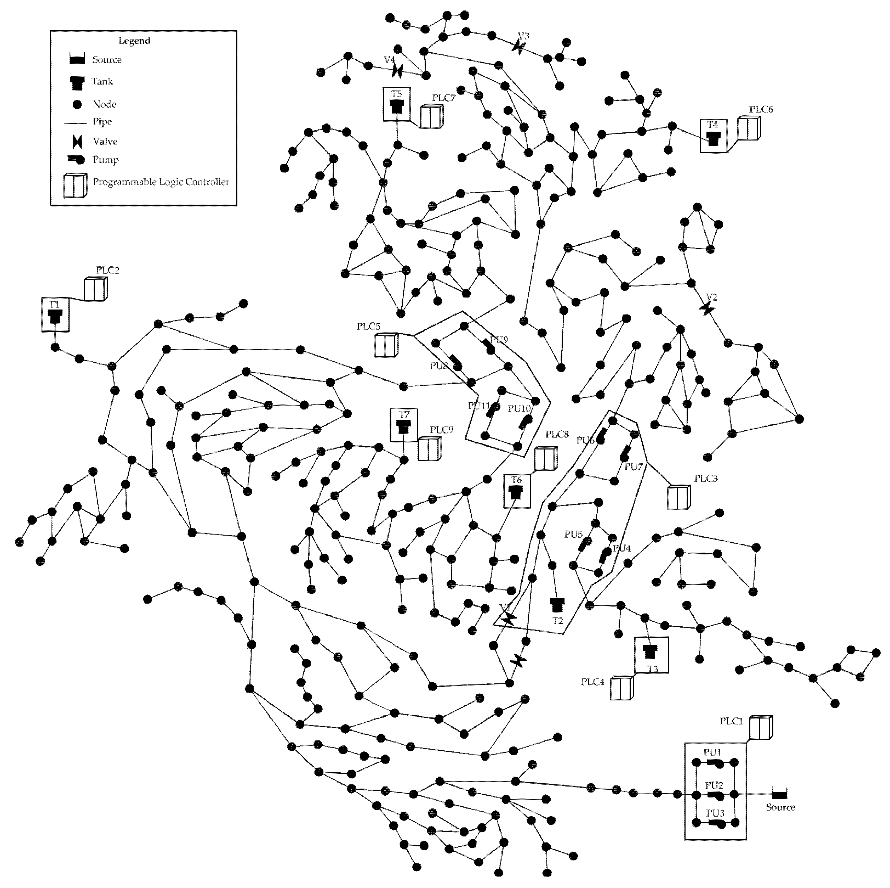 - Taormina, R.; Galelli, S.; Douglas, H.C.; Tippenhauer, N.O.; Salomons, E.; Ostfeld, A. A Toolbox for Assessing the Impacts of Cyber-Physical Attacks on Water Distribution Systems. Environ. Model. Softw. 2019, 112, 46–51. [Google Scholar] [CrossRef]