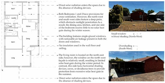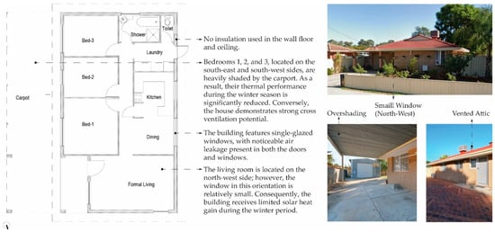 For Case Study 1, Figure 1 (Left) illustrates the architectural plan analysis of the current design features that influence energy efficiency and provides a corresponding photograph (Right).