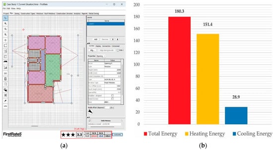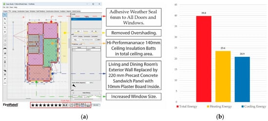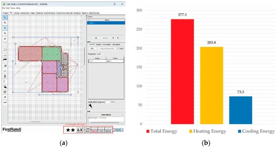 (a) Energy simulation in FirstRate5 using data from Table 6 for Case Study 2. (b) Energy usage of Case Study 2 (MJ/m2).