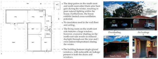 Retrofit refers to upgrading buildings to respond to climate change [], including renovating, repairing, refurbishing, and restoring old buildings to increase energy efficiency []. The primary objective of retrofitting is to mitigate climate change and enhance building resilience against its impacts. Retrofit can be divided into two types: deep and shallow retrofit. Deep retrofitting is an integrated approach, the most effective way to reduce energy consumption, which is costly, and it reduces up to 70% of heating energy demand. Shallow retrofitting means just changing the appliances, and it is a low-cost option that reduces 30% of heating energy demand []. In Australia, well-planned retrofitting can reduce household heating demand by up to 69% and cooling demand by 38% []. The NCC (National Construction Code) of Australia 2022 requires new homes to achieve a 7-star NatHERS rating, taking into account major fixed appliances as well as on-site energy generation and storage. This is an increase from the previous 6-star requirement and also includes provisions for retrofitting existing homes to improve energy efficiency and reduce emissions []. Retrofit has many benefits, such as improving health issues, reducing fuel poverty, developing a resilient society, and creating employment opportunities []. Numerous studies have demonstrated that retrofitting enhances the energy efficiency of existing buildings. Retrofitting can reduce energy consumption by 80%, requiring high investment and a long payback period []. The energy waste depends on the building age; older buildings waste more energy than new buildings [].