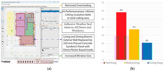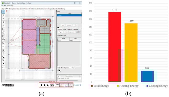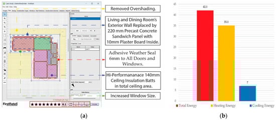 (a) Energy simulation in FirstRate5 using data from Table 8 for Case Study 3. (b) Energy usage of Case Study 3 (MJ/m2).
