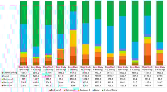 The living area exhibits the highest space-heating demand (Table 5) due to suboptimal window orientation and shading, with a small northwest-facing window and a larger southwest-facing window heavily shaded by a patio (Figure 1). This results in a relatively low cooling load. The combined living/kitchen area shows the second highest heating demand, remaining largely shaded despite two large windows. Bedroom 2 has the highest heating demand among the bedrooms, followed by Bedrooms 1 and 3. Bedrooms 1 and 2 feature two windows on the southwest and southeast facades without shading devices or extended eaves, and one external wall is permanently shaded by a patio, reducing overall thermal performance.