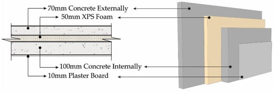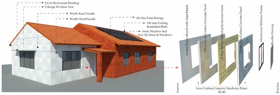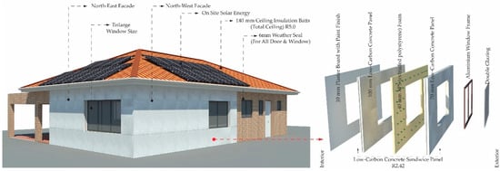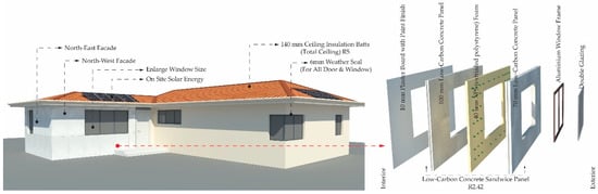 Deep or whole-house retrofitting is more beneficial for energy efficiency, while shallow retrofitting offers a more affordable option. Additionally, the main barriers to deep retrofitting are the time required and the disturbance it causes to occupants. Every state in Australia faces a housing crisis [], and relocating to another house or taking a long time to complete whole-house retrofitting is often tricky. For these reasons, selecting optimal retrofitting options that require minimal time and do not necessitate relocating occupants during the retrofit work is essential. Modular precast retrofitting options are more suitable for completing the retrofitting work quickly. For instance, a modular low-carbon precast concrete sandwich panel (Figure 9) for the external wall, which could improve the overall thermal quality and energy efficiency of the building’s external wall, is a viable option for external wall retrofitting with lower emissions. Retrofitting aims to reduce energy demand, supporting Australia’s commitment to achieving net-zero emissions by 2050. The selection of optimal retrofitting options is informed by the literature review, which applied the case study building to compare the overall improvement of energy efficiency of those buildings.