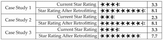 Figure 6a shows that Case Study 3 has a current energy rating of 3.3 stars. The house’s heating and cooling energy demands are 148.9 MJ/m2 and 28.9 MJ/m2, respectively, resulting in a total energy requirement of 177.3 MJ/m2 (Figure 6b). Notably, the demand for space heating is nearly six times higher than that for space cooling.