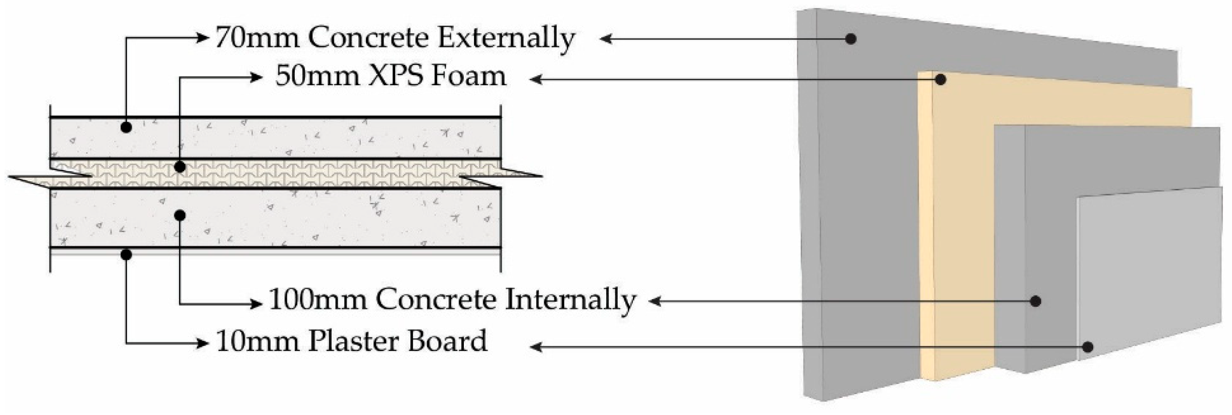 External Wall | Yes | At the northeast and northwest sides of the living room, the external wall transitions to a low-carbon concrete sandwich panel (external concrete panel: 70 mm, middle XPS (Extruded Polystyrene Foam) foam: 40 mm, internal concrete panel: 100 mm) with a 10 mm plasterboard finish internally. Total area = 46.3 m2, R = 2.42, and U = 0.41. |