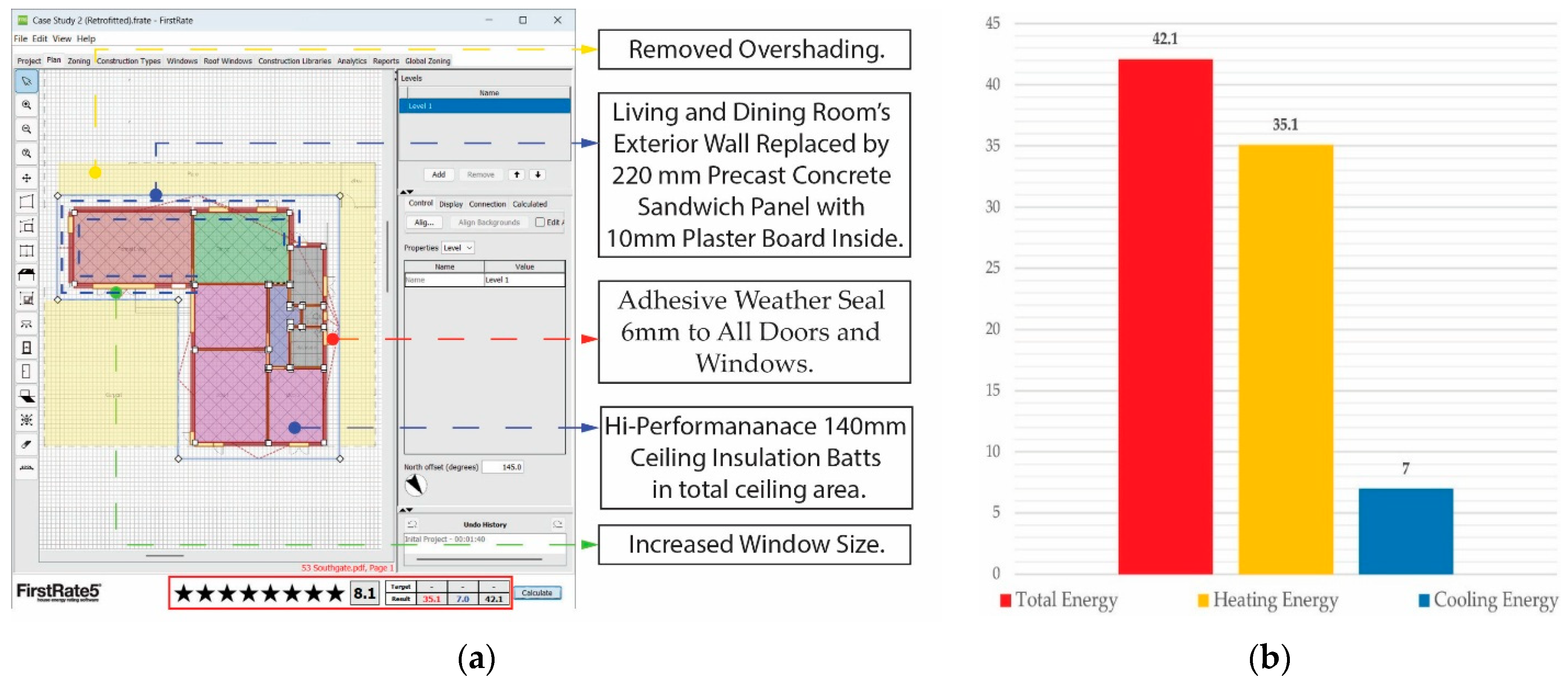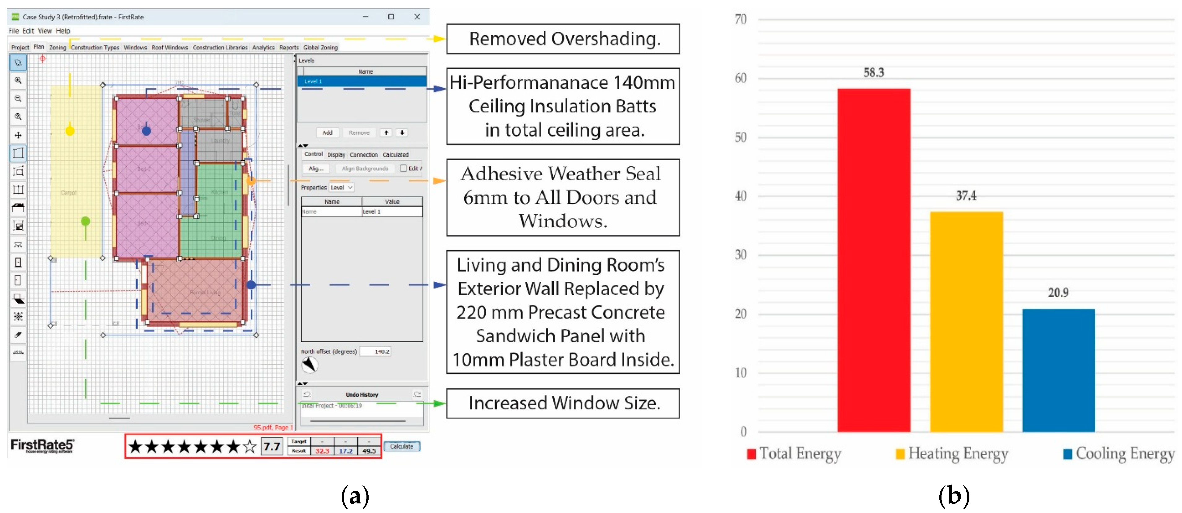 External Wall | Yes | The external walls of the living, dining, and kitchen areas have been changed to a low-carbon concrete sandwich panel (external concrete panel: 70 mm, middle XPS (Extruded Polystyrene Foam) foam: 50 mm, internal concrete panel: 100 mm) with a 10 mm plasterboard finish internally. Total area = 63.4 m2, R = 2.42, and U = 0.41. |