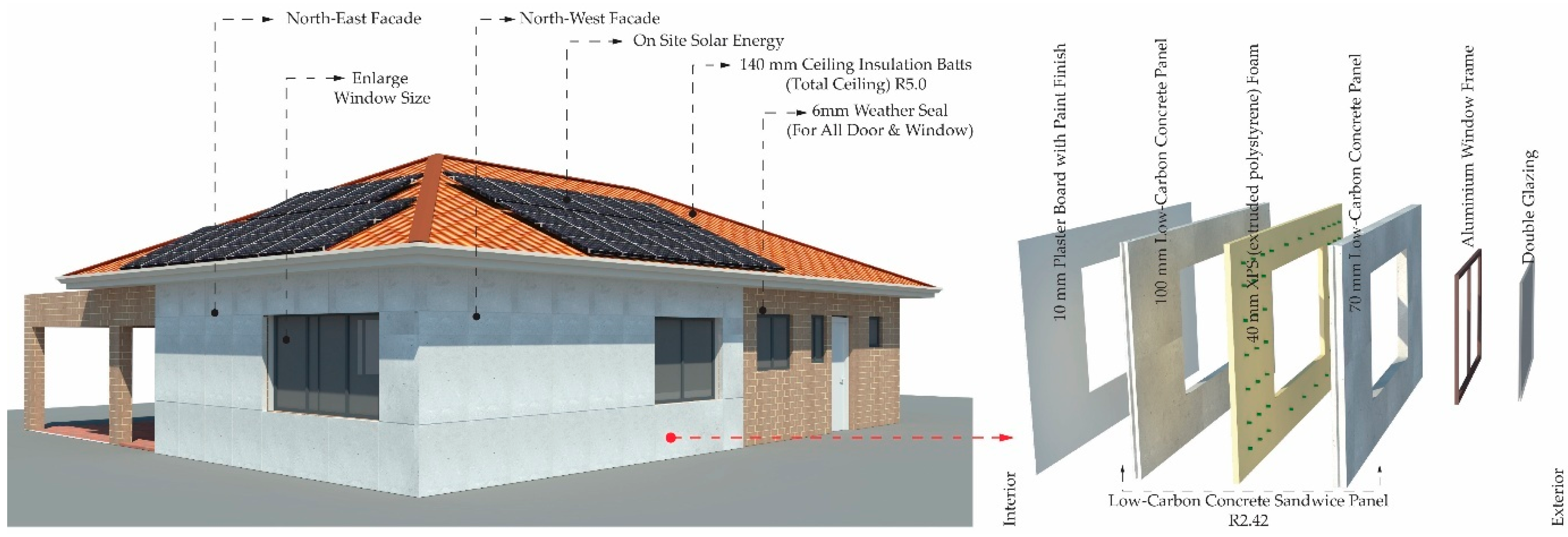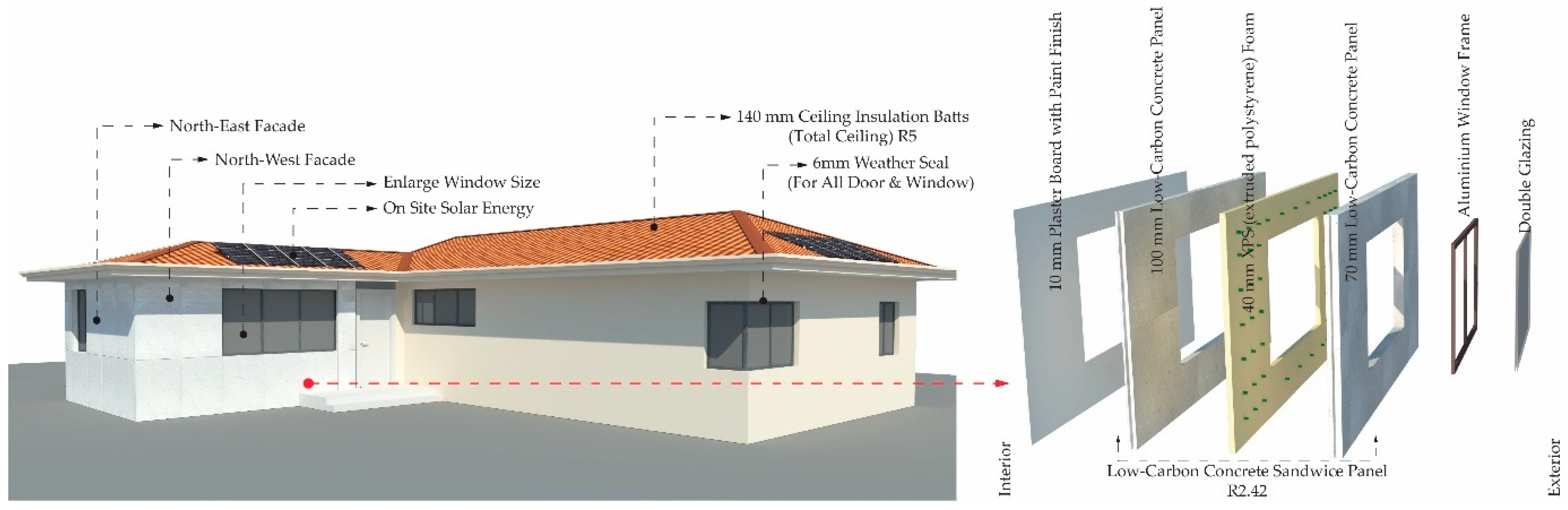 External Wall | Yes | The living, dining, and kitchen external wall is changed to a low-carbon low-concrete sandwich panel (external concrete panel 100 mm, middle XPS (Extruded Polystyrene Foam) foam 40 mm, internal concrete panel 70 mm) with 10 mm plaster board finish internally. Total area = 34.2 m2, R = 2.42, and U = 0.41. |