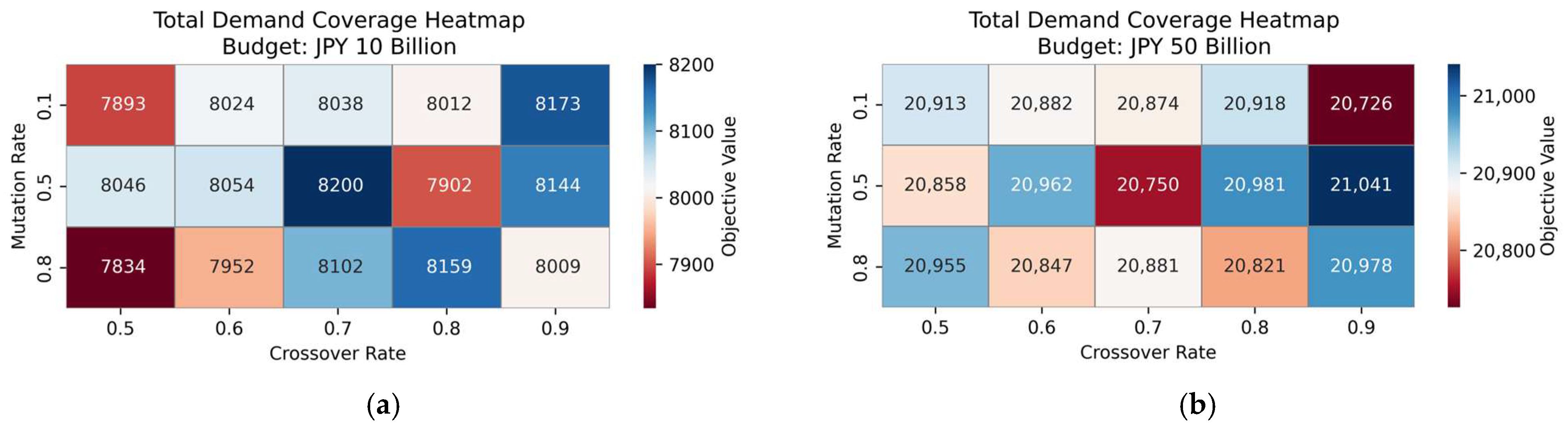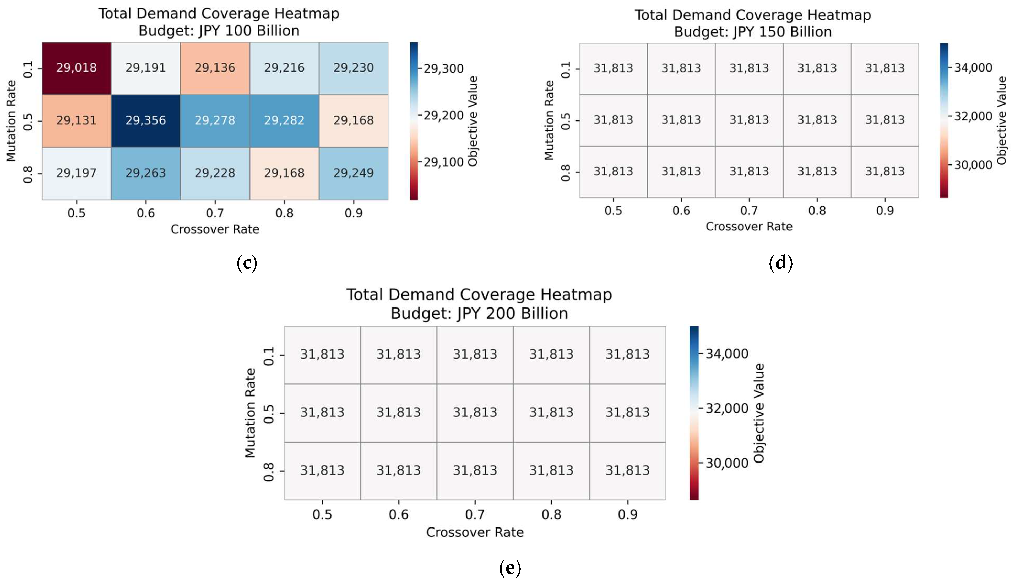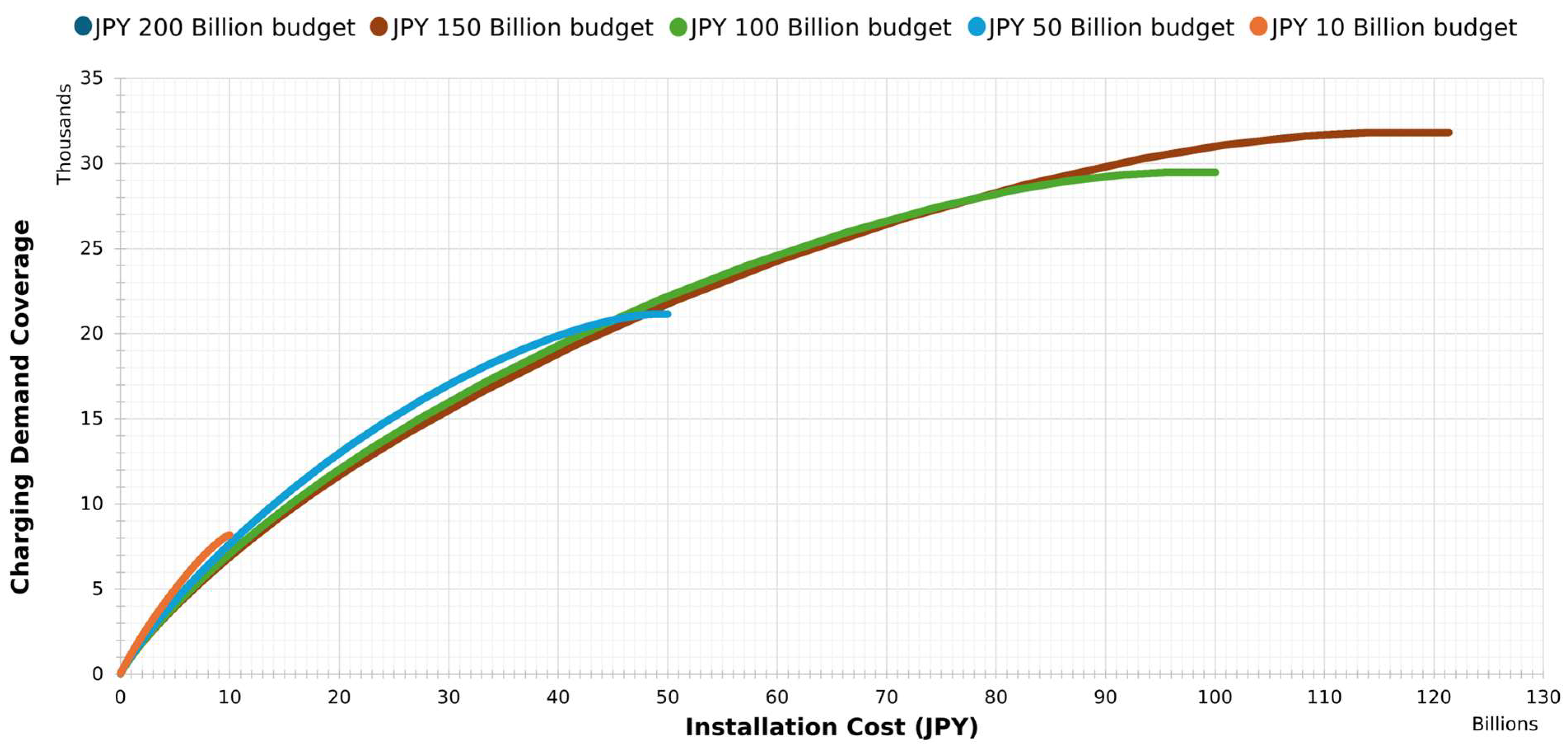 Budget (JPY Billion) | Served Demand | Demand Coverage | Station Selected | Chargers Installation (Fast/Normal) | Budget Used (JPY Billion) |