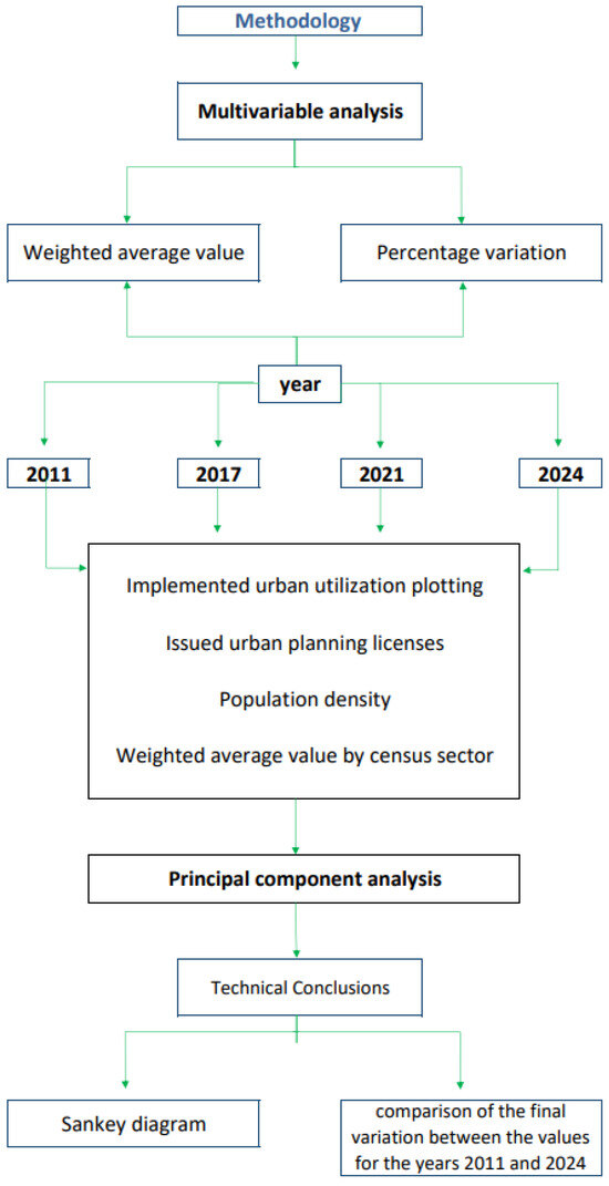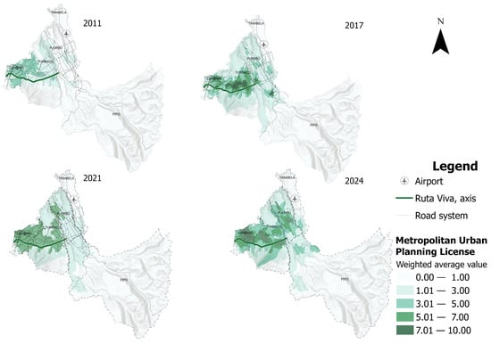 The methodology integrates procedures of systematization, weighting, normalization, and factor analysis applied to four key variables: building coverage ratio (COS), building permits (metropolitan licenses), population density, and variation in land value. The analysis is conducted for the periods 2011 (before Ruta Viva’s construction) and the years following its commissioning—2017, 2021, and 2024—concerning the applicable regulatory instruments.