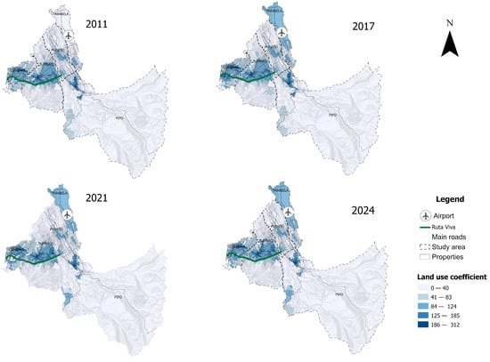 Table 2, Pifo shows the largest cumulative increase (2011–2024: +5.16%), Cumbayá and Puembo grow moderately (+2.56%, +2.50%), Tababela nets +0.55% after sharp swings, and Tumbaco declines (−4.87%). The 2017 drop aligns with the regulatory shift introduced by PUOS/ZC and is followed by a partial recovery. The commissioning of Ruta Viva generated a favorable environment for intensive urbanization in certain areas, particularly those with flexible regulations and high real estate pressure.