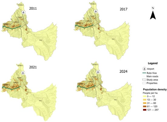 Likewise, the results show that accelerated demographic growth in parishes such as Cumbayá has generated increasing pressure on existing infrastructure, particularly on the local road system. With more than 42,000 inhabitants in 2024 and a density above 20 inhabitants per hectare, this parish is consolidating into an emerging centrality and accounts for 25.2% of the study area’s population (