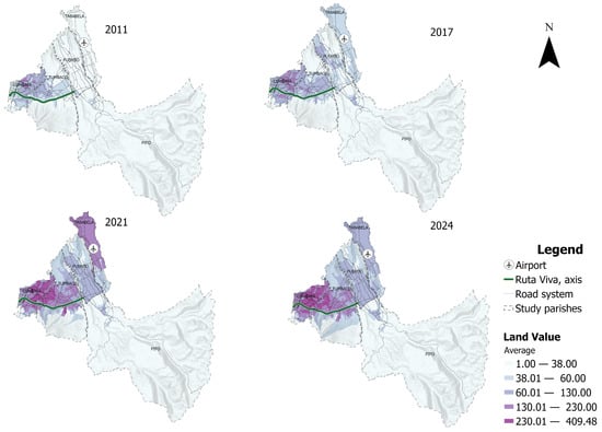 The evolution of land value shows a constant increase in each period analyzed. On average, the price per square meter across the entire study area has more than tripled, rising from USD 38.01 in 2011 to USD 128.59 in 2024. In general, the average values are: 2011: USD 38.01; 2017: USD 60.92 (60.02% relative to 2011); 2021: USD 114.18 (87.3% relative to 2017); and 2024: USD 128.59 (12.6% relative to 2021).