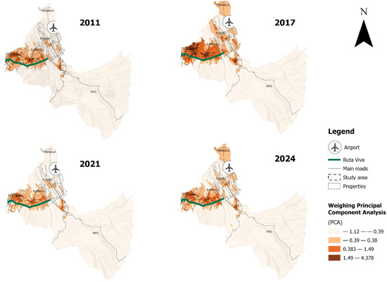 The following map presents the spatial distribution of the weighted values obtained through PCA for the years 2011, 2017, 2021, and 2024 (
