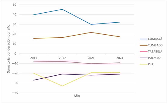 Figure 8. This graph illustrates the dynamics of territorial transformation for each parish under study, allowing the identification of trends and differences in impact levels resulting from the implementation of the Ruta Viva road project and the corresponding urban planning policies.