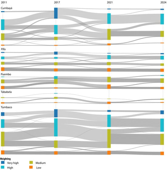 The graph illustrates the temporal dynamics of territorial impact categories (Very High, High, Medium, and Low) for the parishes of Pifo, Puembo, Cumbayá, Tababela, and Tumbaco between 2011 and 2024. Each flow represents the percentage transition of census tracts within each category between consecutive periods, highlighting stability or change in the intensity of territorial impact associated with the implementation of the Ruta Viva road project and related urban planning policies.