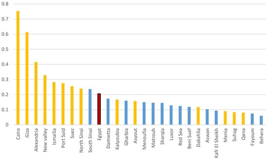 Non governorate in the Delta (Sharkia, Damietta, Menoufia, Dakahlia, Kafr El Sheikh, and Gharbia) or Upper Egypt (Asyout, Luxor, Suhag, Aswan, New Valley, Fayoum, Menia, and Qena) performed better than the national average (score 28.19) on the “Smart” Infrastructure (SI) subindex. In contrast, governorates in the Greater Cairo region, a majority of governorates in the Suez Canal region (Ismailia, Port Said, South Sinai, and Suez), and the Alexandria governorate are situated above the national average (see Figure 5). Cairo, Alexandria, Port Said, Giza, Suez, and Ismailia are among the six governorates in Egypt where the government plans to construct new cities; these governorates all perform better than the country as a whole in the “Smart” infrastructure (SI) sub-index. However, the SI sub-index is lower than the national average in eight other governorates—Kalyoubia, Dakahlia, New Valley, Qena, Asyout, Menia, Suhag, and North Sinai—where the government also intends to construct new urban centers. Furthermore, the “Smart” infrastructure (SI) sub-index scores of the Red Sea and South Sinai are higher than the national average, despite the fact that these areas have not been designated for the creation of new cities.