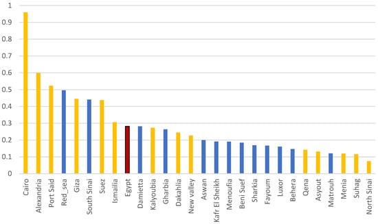 The Egyptian governorates’ ranking according to the values of the “Smart” infrastructure (SI) sub-index. Note: Governorates in orange color show the regions where the government intends to create new cities. The red bar represents the national average for Egypt, while the blue bars represent individual governorates without smart city plans. Source: own calculations.