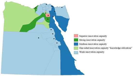 Classification of Egyptian governorates by their innovation capacity. Note: Black dots refer to the locations of the 14 smart cities proposed by Egypt’s Vision 2030, while the different colors represent the innovation capacity of the 27 Egyptian governorates.