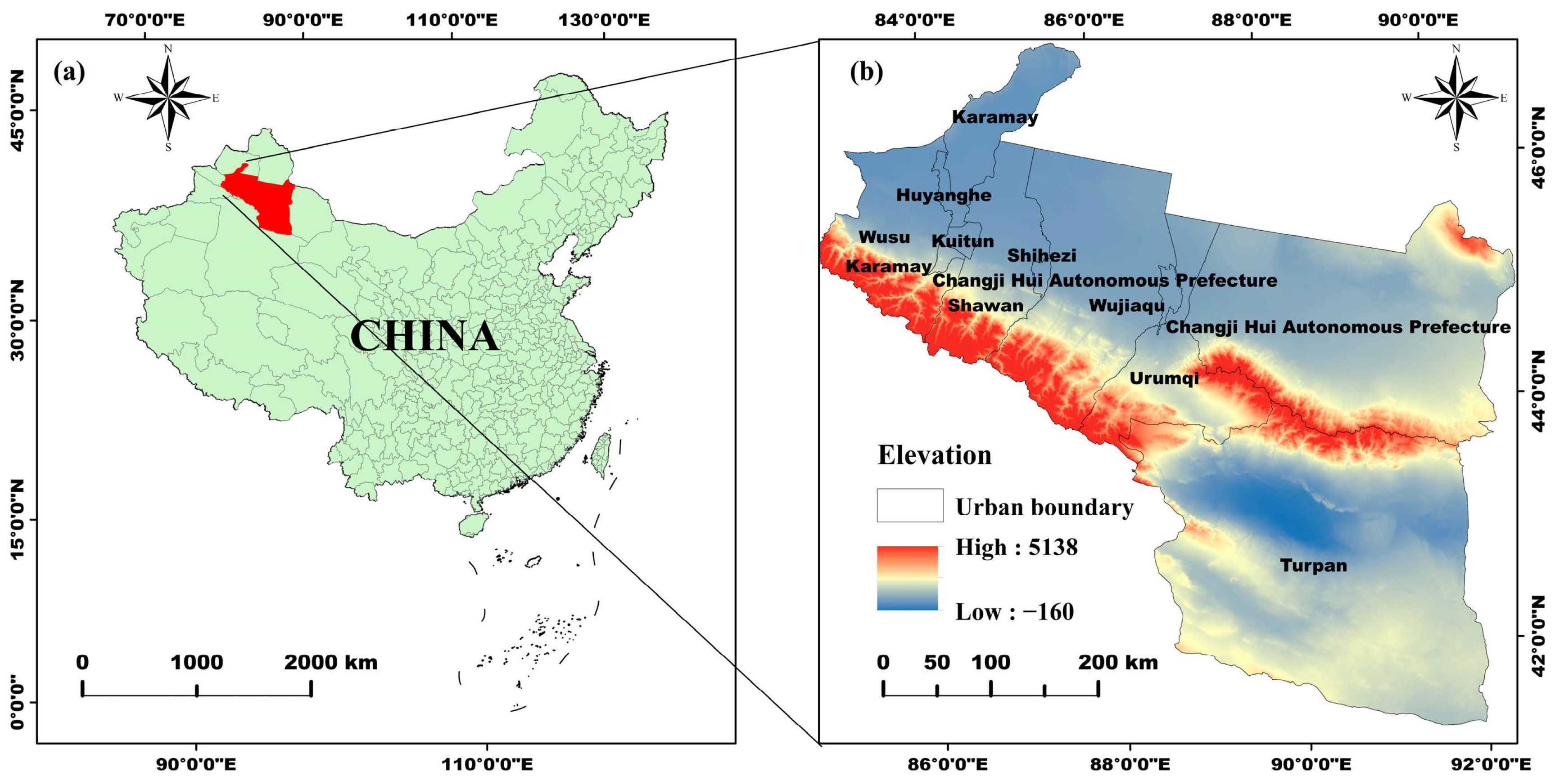 - Yu, T.; Abulizi, A.; Xu, Z.; Jiang, J.; Akbar, A.; Ou, B.; Xu, F. Evolution of environmental quality and its response to human disturbances of the urban agglomeration in the northern slope of the Tianshan Mountains. Ecol. Indic. 2023, 153, 110481. [Google Scholar] [CrossRef]