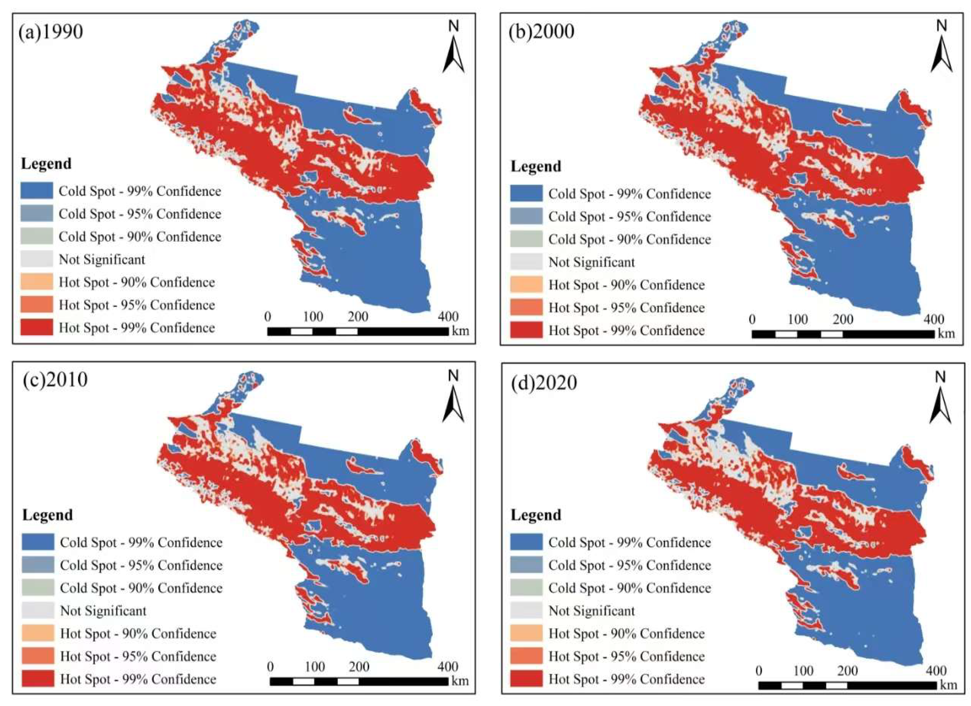 Year | Cold Spot-99% Confidence (Area, km2) | % | Cold Spot-95% Confidence (Area, km2) | % | Cold Spot-90% Confidence (Area, km2) | % | Hot Spot—90% Confidence (Area, km2) | % | Hot Spot—95% Confidence (Area, km2) | % | Hot Spot—99% Confidence (Area, km2) | % |