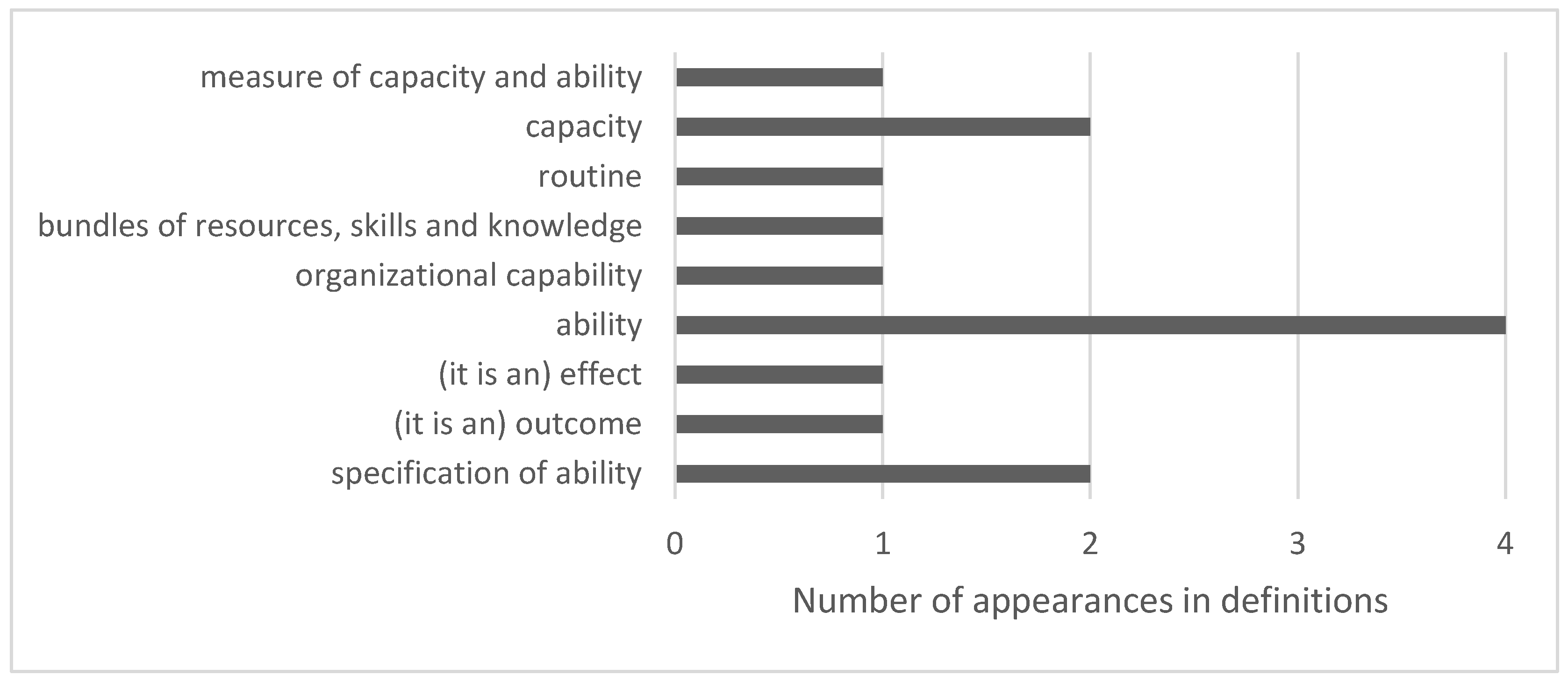 8 | An organisational capability is a high-level routine (or collection of routines) that, together with its implementing input flows, confers upon an organisation’s management a set of decision options for producing significant outputs of a particular type. NOTE: The term routine here means “repetitive pattern of activity” | [64] |
