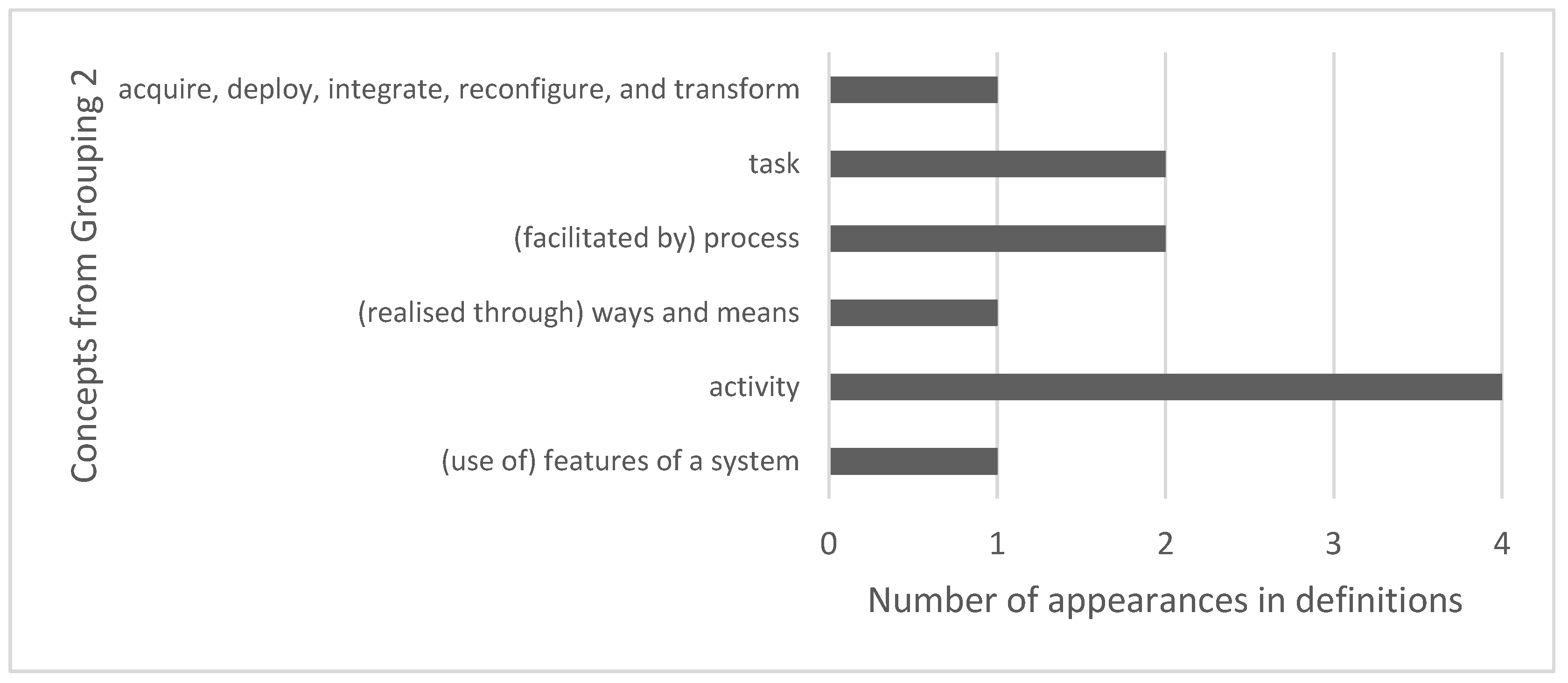 - Group Phase: Extracted concepts were grouped based on logical connections and semantic similarity (i.e., concepts with similar or identical meanings were clustered together). Categories emerged inductively from the data rather than using predetermined frameworks. Grouping decisions were documented in a cleaned Excel table organising concepts into four primary groupings, with frequency analysis conducted to track concept appearance across definitions.