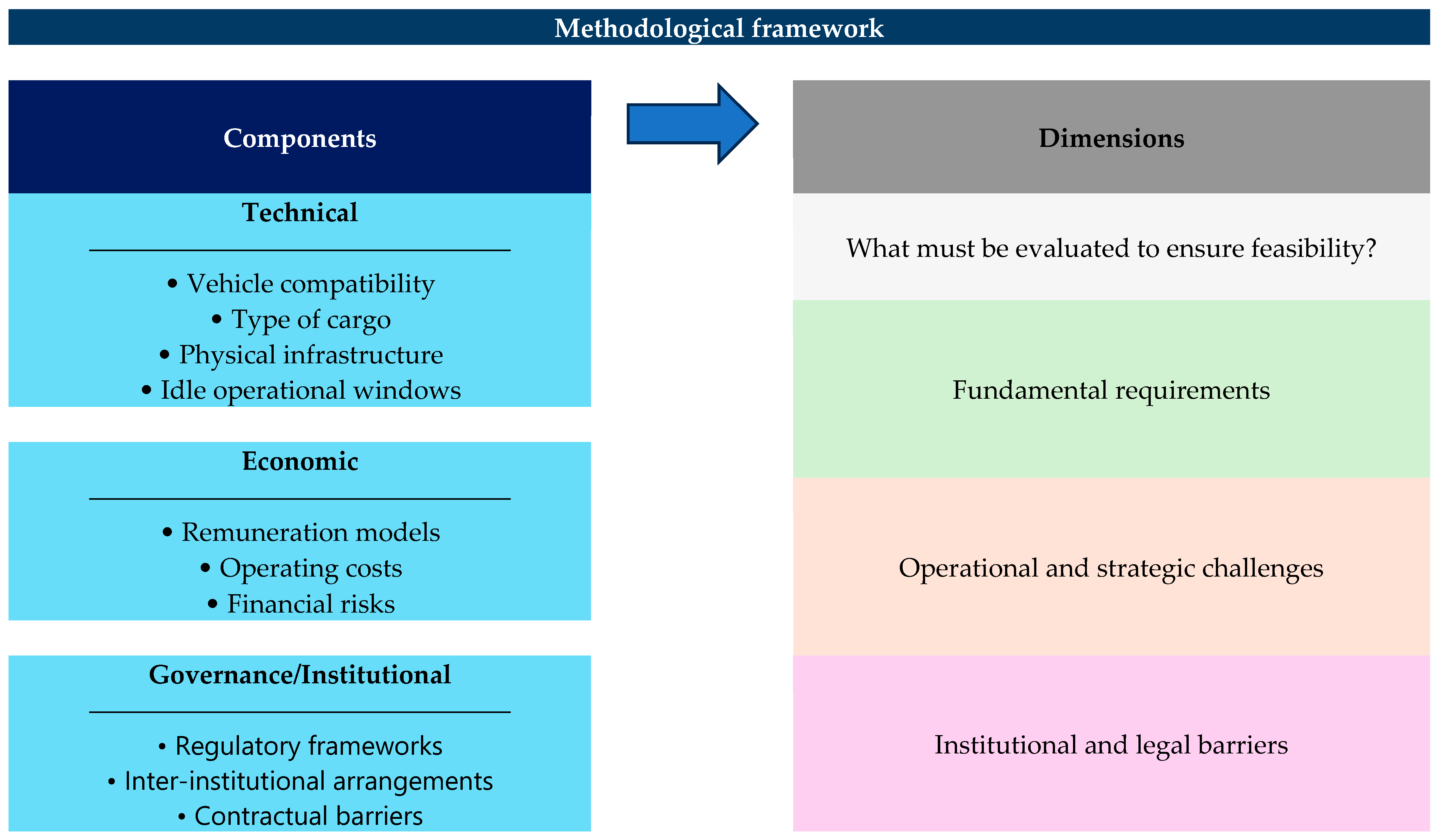 Methodologically, this research advances beyond previous conceptual approaches by proposing a structured tri-dimensional framework—technical, economic, and governance—that enables systematic evaluation of BRT-based freight. Unlike earlier descriptive studies, this framework can guide both academic research and applied pilot projects. It also offers a replicable tool for assessing the feasibility of multifunctional transport systems in emerging economies, where resources for new infrastructure are limited but BRT networks are consolidated.