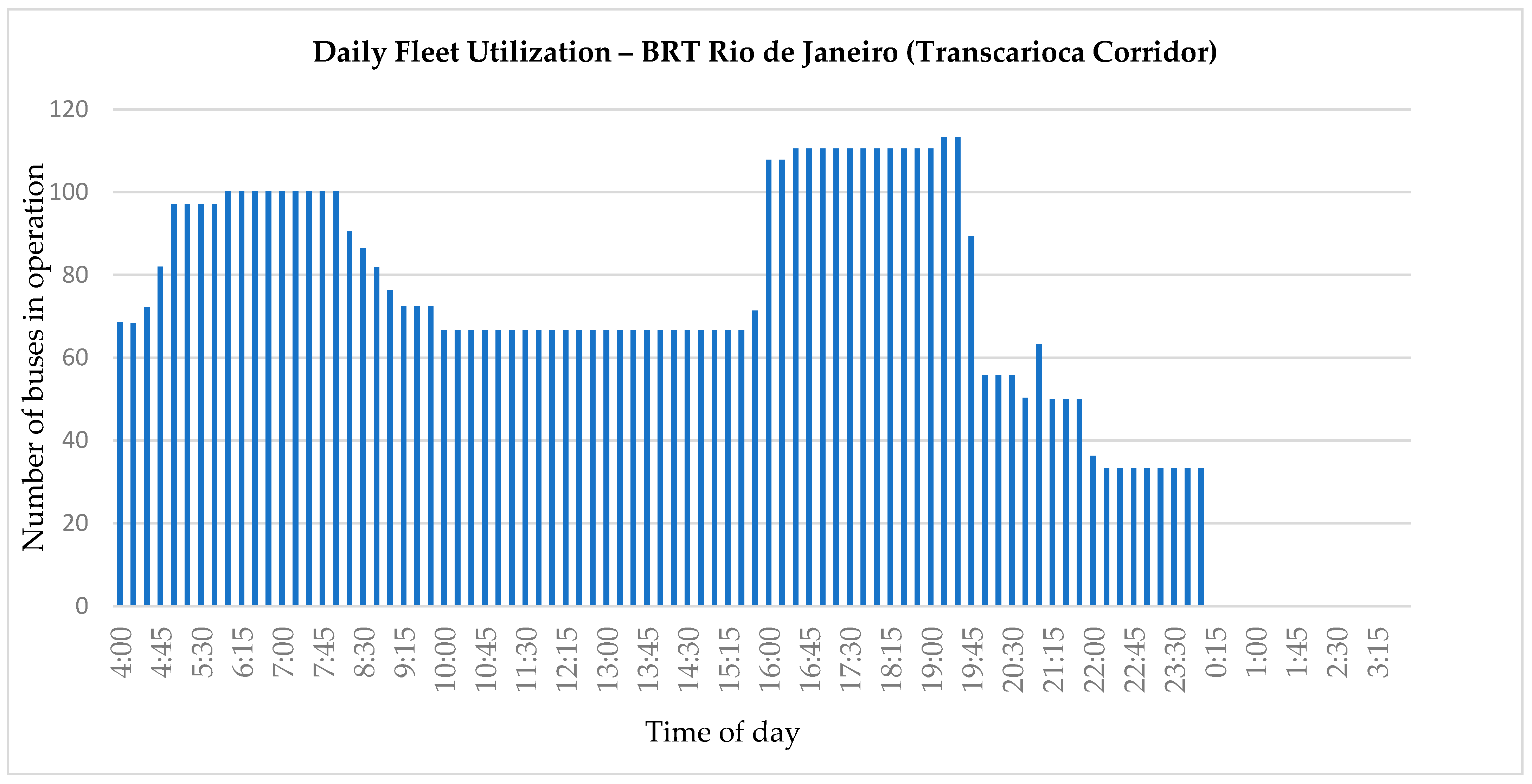 For the selected route (78 km round trip), the cycle time—including travel time and loading/unloading operations—was estimated at 140 min during peak hours and 90 min during off-peak periods. Thus, within the idle window, it would be possible to use at least 20 vehicles to perform three complete round trips in middle-mile service.