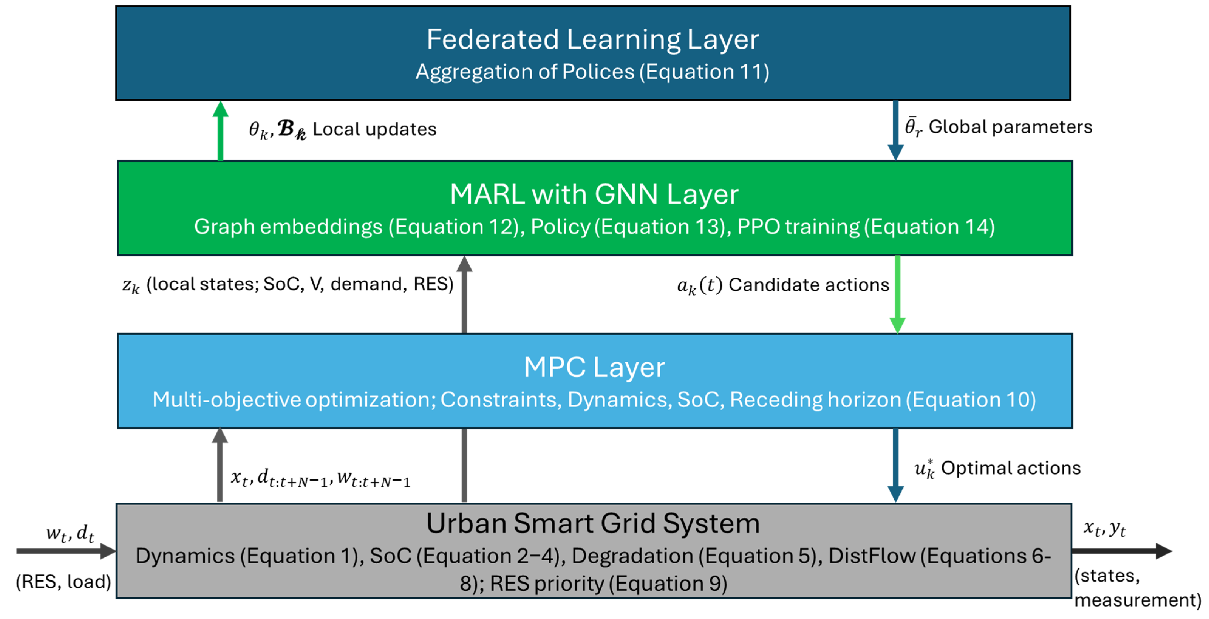 Proposed Framework (FL-MARL-MPC): The full decentralised system (Algorithms 1–4), with MARL+GNN generating topology-aware candidate actions (Equations (12)–(14)), MPC refining for multi-objective optimisation (Equations (10) and (15)) including RES prioritisation (Equation (9)), and FL aggregating policies privately (Equation (11)). Projections via POCS ensure constraint satisfaction (e.g., Equations (3)–(4), (6)–(8)).