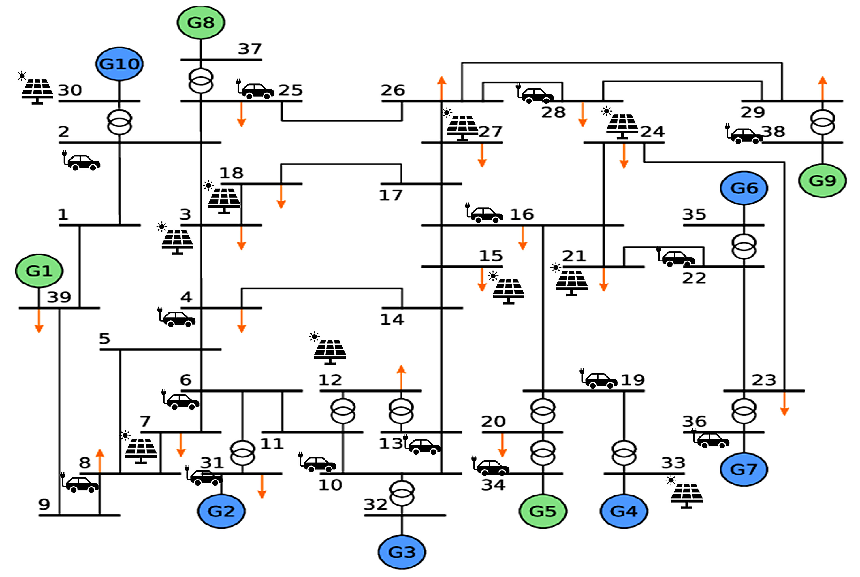(Equation (9)). Fifteen buses (2, 4, 6, 8, 10, 13, 16, 19, 22, 25, 28, 31, 34, 36, 38) host EV charging stations, dynamically connecting fleets of 200, 500, or 1000 EVs based on urban mobility patterns. Non-EV loads are distributed across all 39 buses, with diurnal peaks at 18:00–22:00 modelled as exogenous inputs