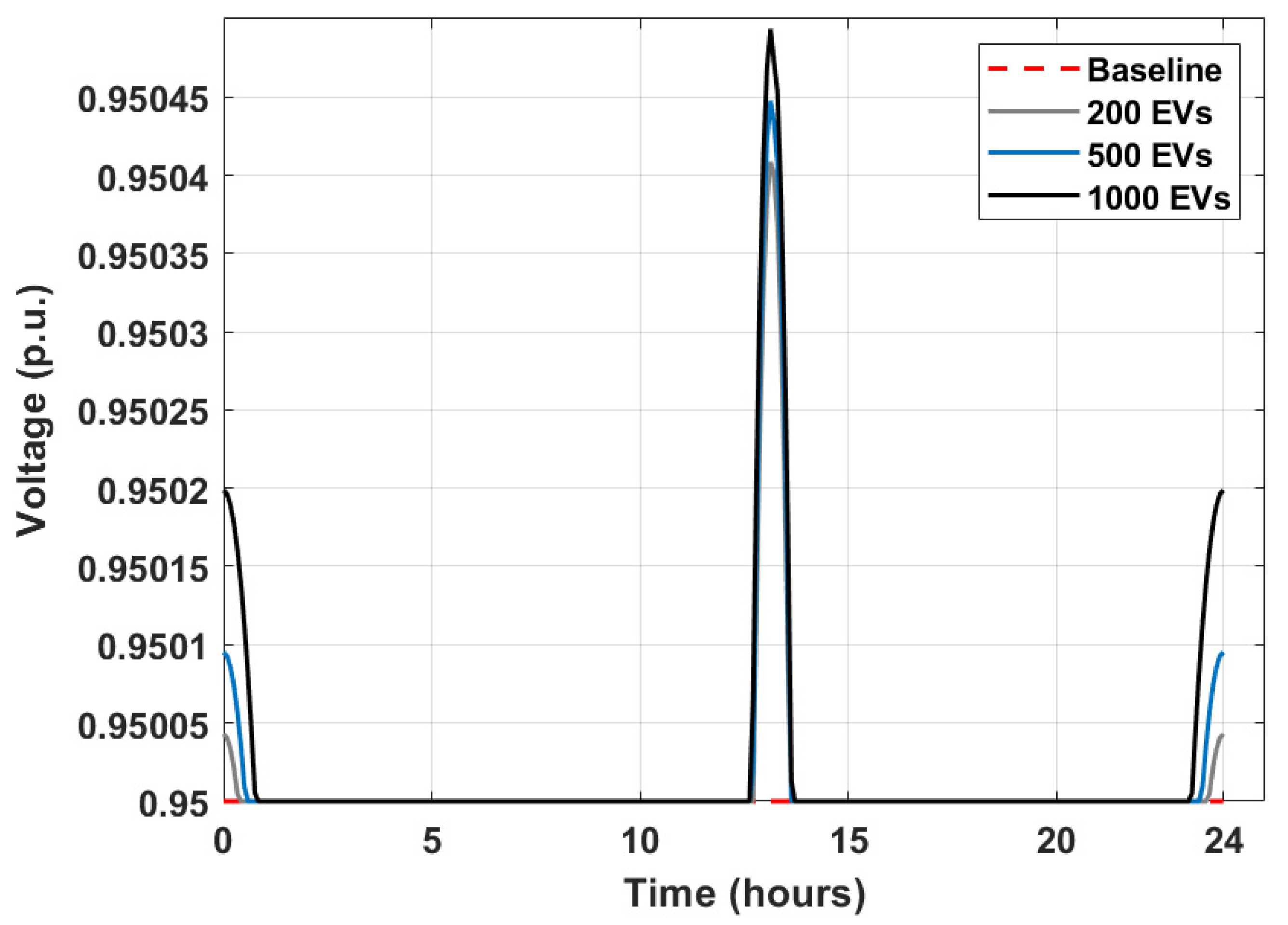 ) throughout the 24 h. The proposed strategy improves midday voltages slightly (~0.0005 p.u.) by aligning EV charging with renewable generation, thereby reducing feeder stress and counteracting voltage drops.
