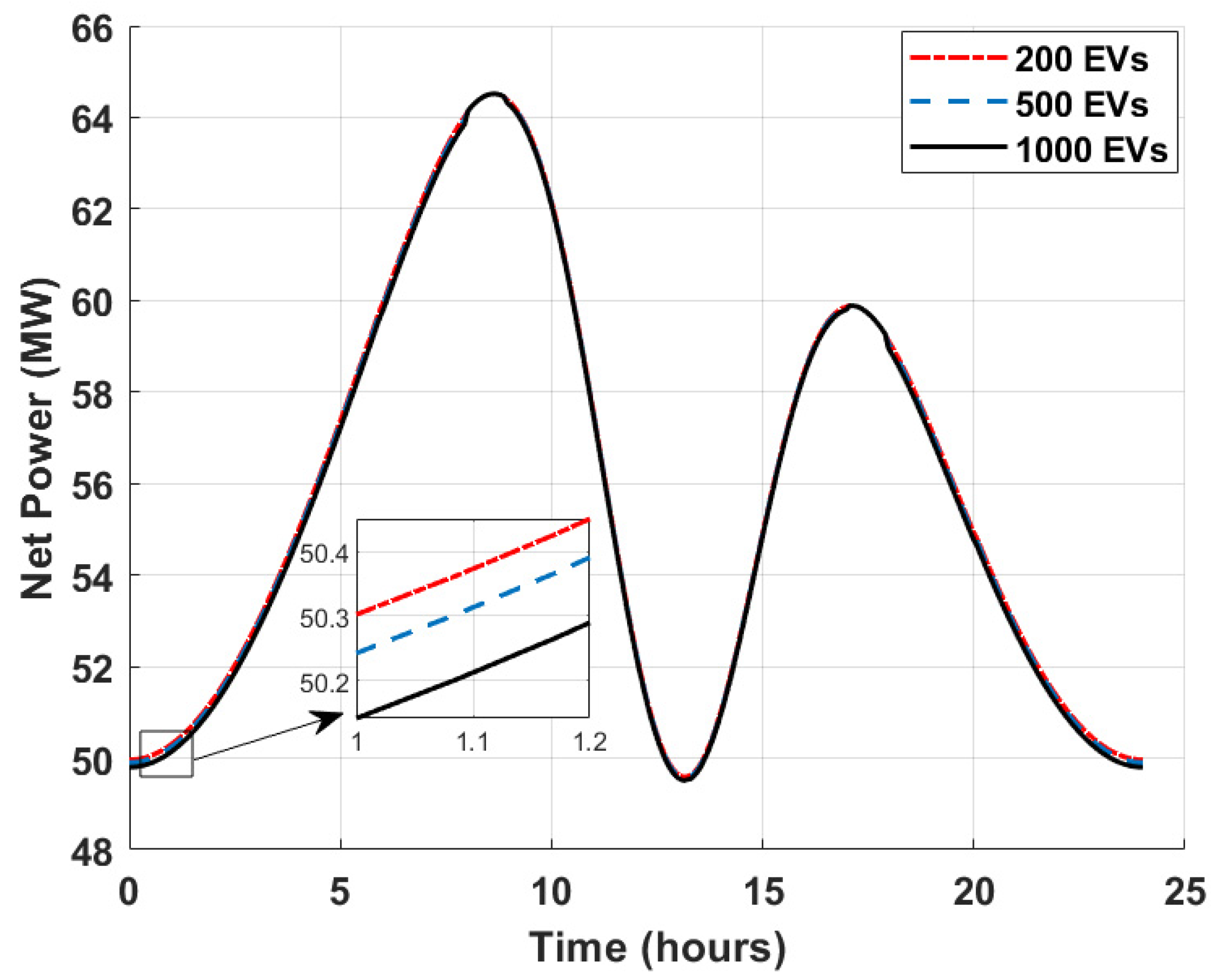 Figure 4 shows feeder net power profiles for the proposed framework across EV scales, i.e., 200, 500, and 1000 EVs. The main curve highlights evening peak (18:00–22:00 h) shaving (e.g., from 11.33 MW baseline to 11.31 MW at 1000 EVs via V2G discharge), supporting grid reliability claims. The inset magnifies a short interval, showing that curves for different fleet sizes overlap closely. This highlights the scalability of the proposed framework, which delivers nearly identical normalised responses regardless of fleet size. The profiles differ slightly due to increased charging demand with larger fleets (e.g., 1000 EVs show higher peaks before V2G mitigation), but the framework’s V2G discharge (Equations (3)–(4)) and MARL-GNN policies (Equations (12)–(14)) effectively shave peaks, maintaining similar net power trends. Although the improvement magnitude is small in per-unit terms, it is significant for distribution feeders, where even minor deviations can affect protection margins and power quality. These results support the claim of enhanced stability, consistent with