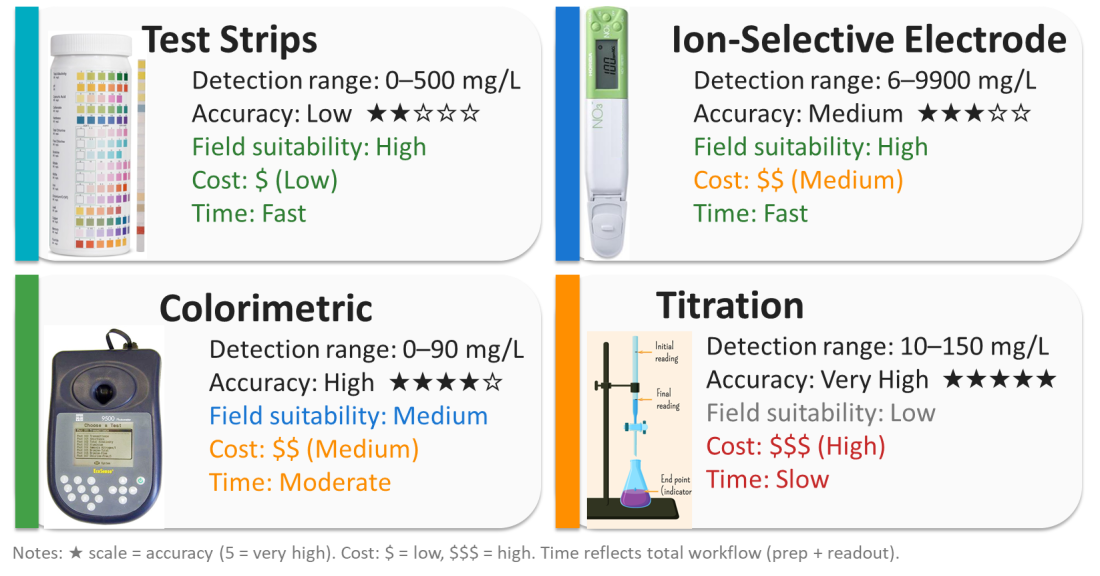 Table 4. Comparative overview of nitrate measurement methods used in this study, highlighting detection range, accuracy, field suitability, cost, and time efficiency. This summary supports method selection based on operational context and analytical requirements.