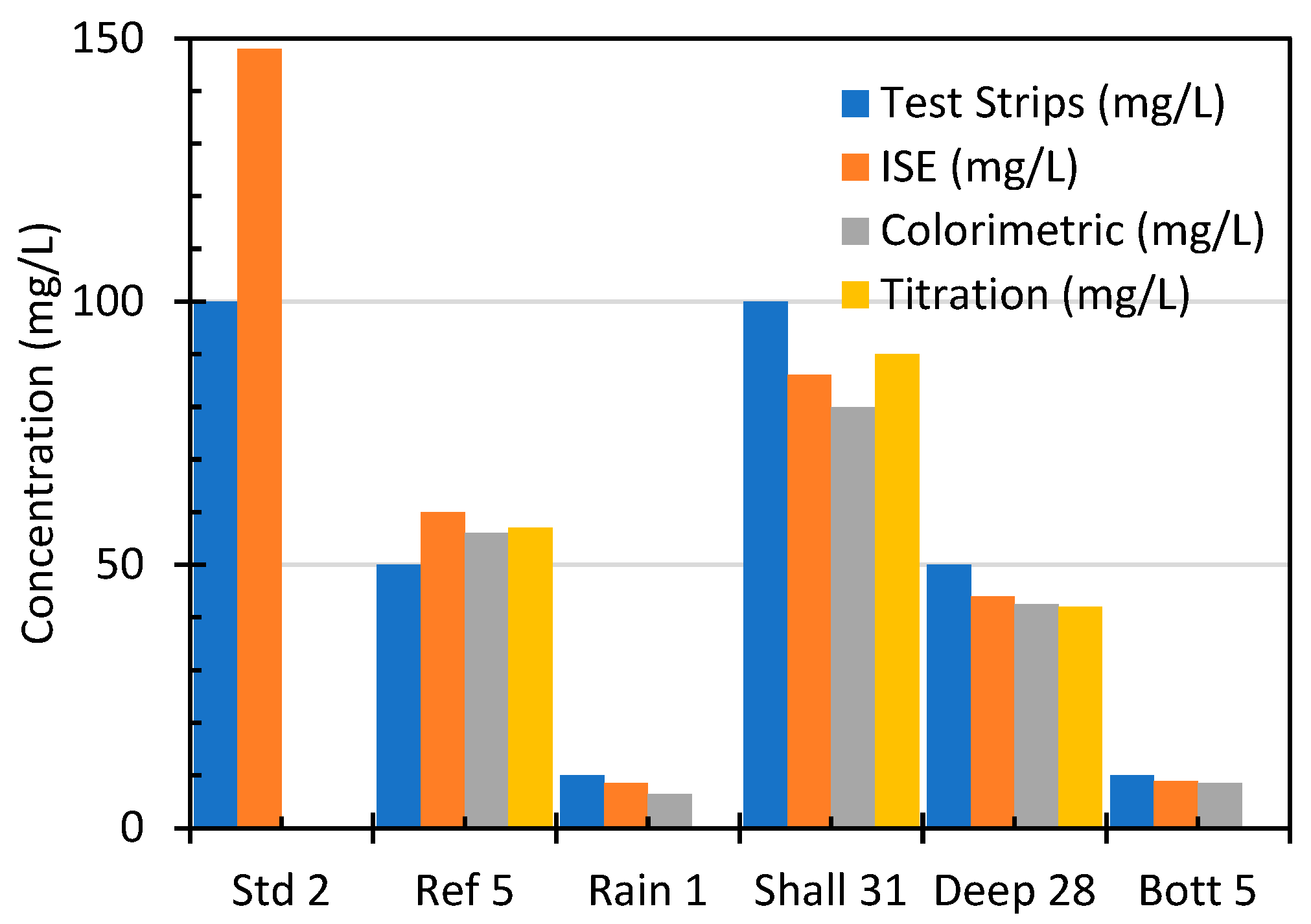 Figure 5. Comparison of nitrate concentrations across analytical methods (Test Strips, ISE, Colorimetric, Titration) for representative samples.