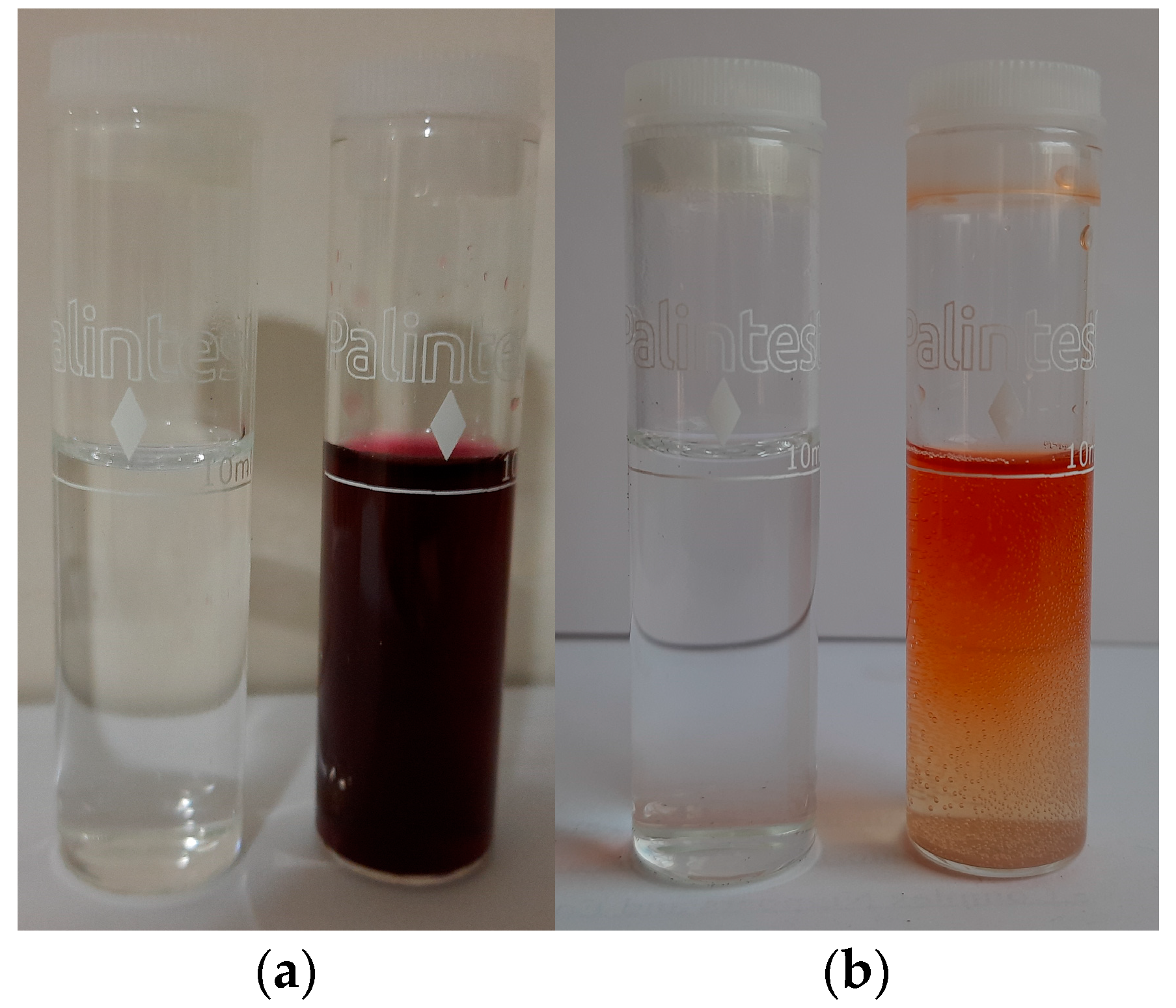 Figure 10. Time-dependent deterioration of reagents for a representative Shall 36 sample: (a) reference sample (left, noncolored) and typical sample (right, colored) immediately prior to photometric measurement and (b) reference sample (left, noncolored) and typical sample (right, colored) 30 min after initial photometer reading.