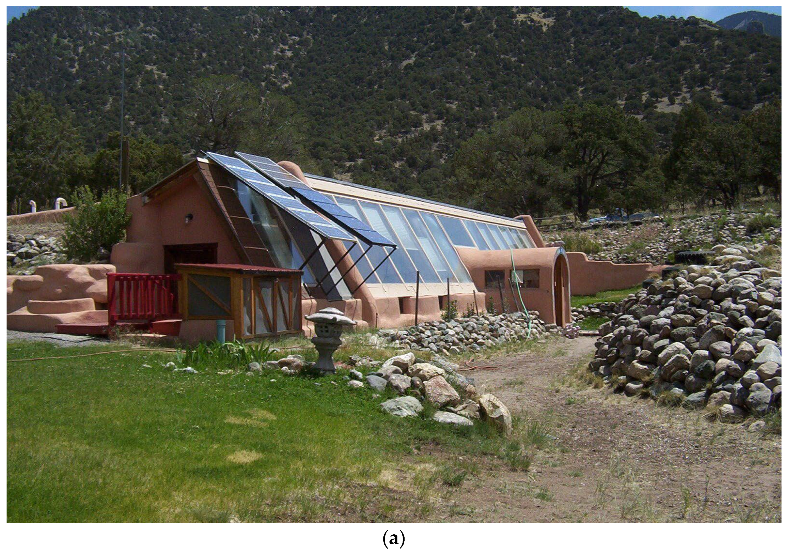 - Bauder, F. Passive Solar Building near Crestone, Colorado: Earthship at the Haidakhandi Universal Ashram. Available online: https://commons.wikimedia.org/wiki/File:Southfacingearthhouse.JPG (accessed on 3 October 2025).