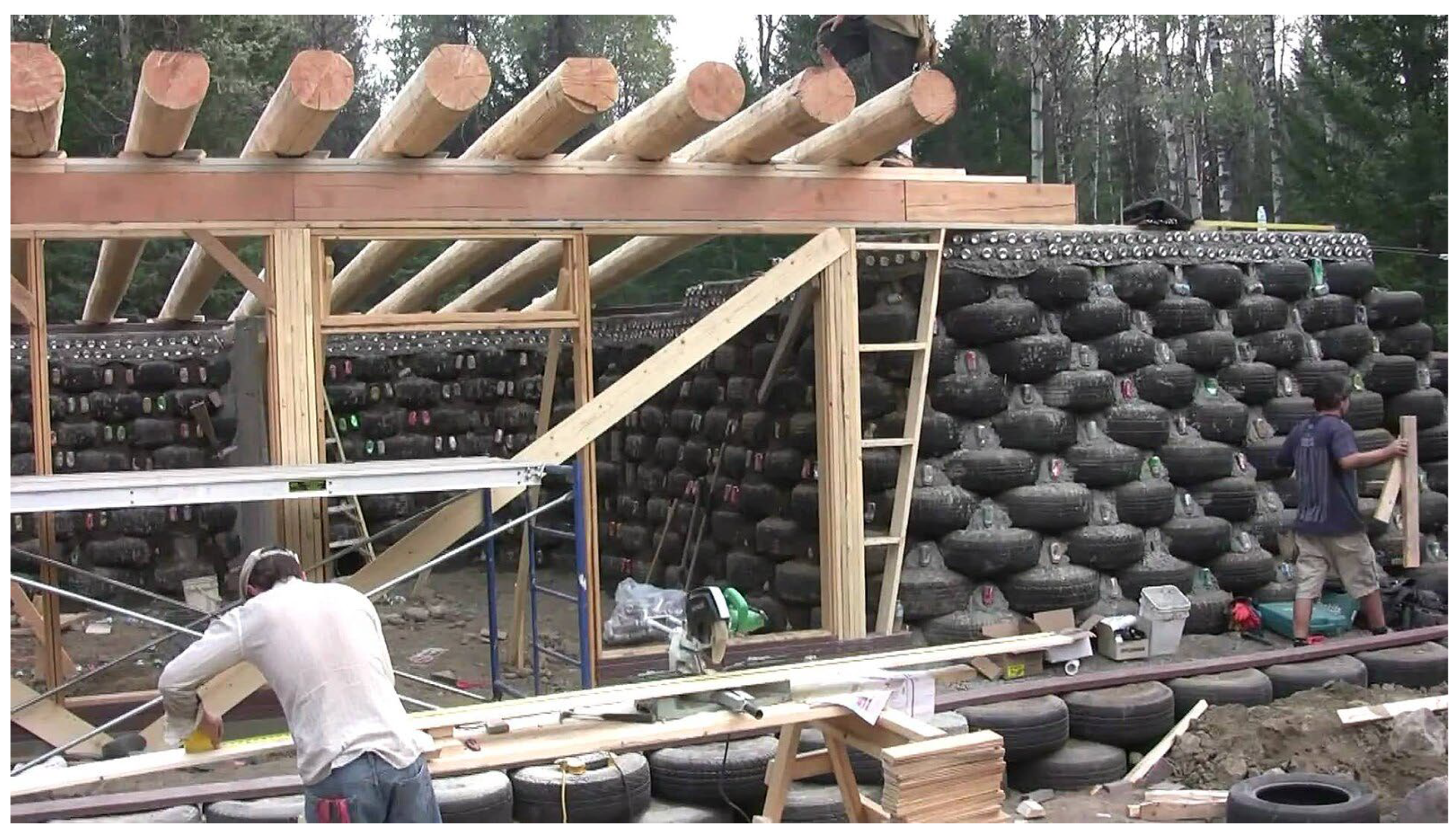 Figure 2 demonstrates the earth-packed tire construction process that forms the structural foundation of these buildings.