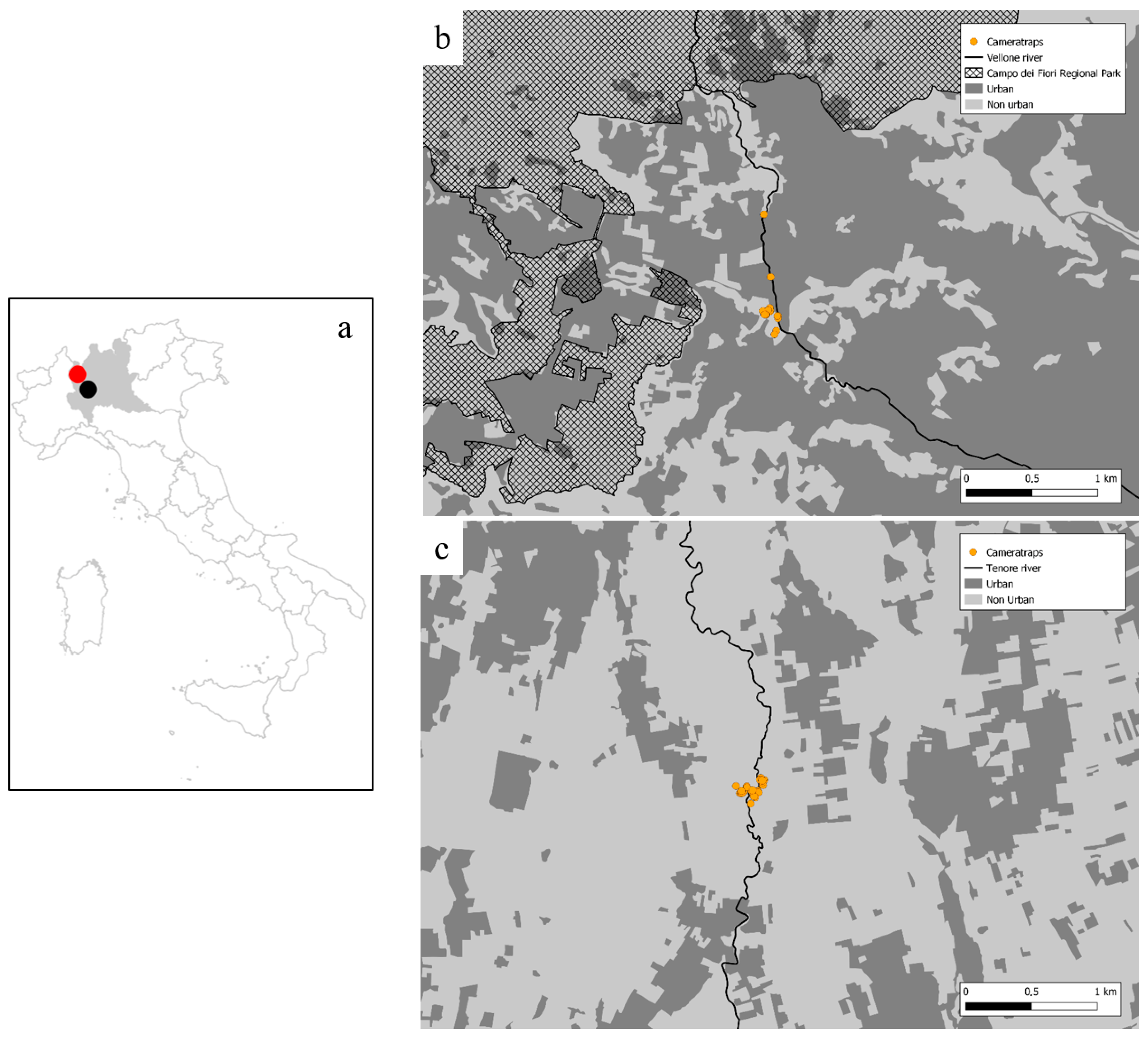 - Panebianco, M. Analisi della Presenza degli Ungulati nel Parco Naturale Regionale Campo dei Fiori Attraverso l’applicazione di Modelli di Occupancy. Master’s Thesis, Insubria University, Varese-Como, Italy, 2021–2022. [Google Scholar]