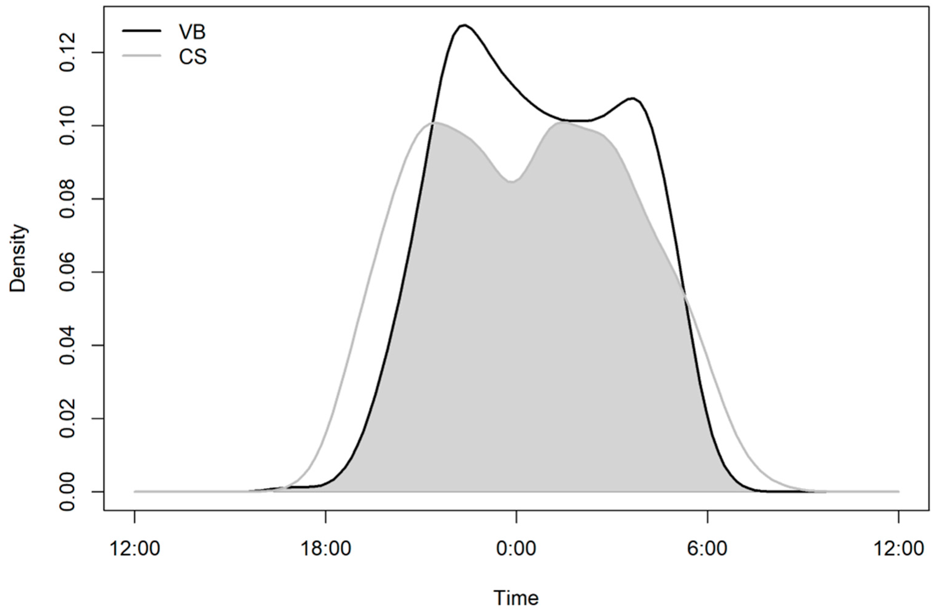 - Meredith, M.; Ridout, M. Overview of the Overlap Package. R. Proj, 1–9. 2014. Available online: https://cran.r-project.org/web/packages/overlap/overlap.pdf (accessed on 26 May 2025).