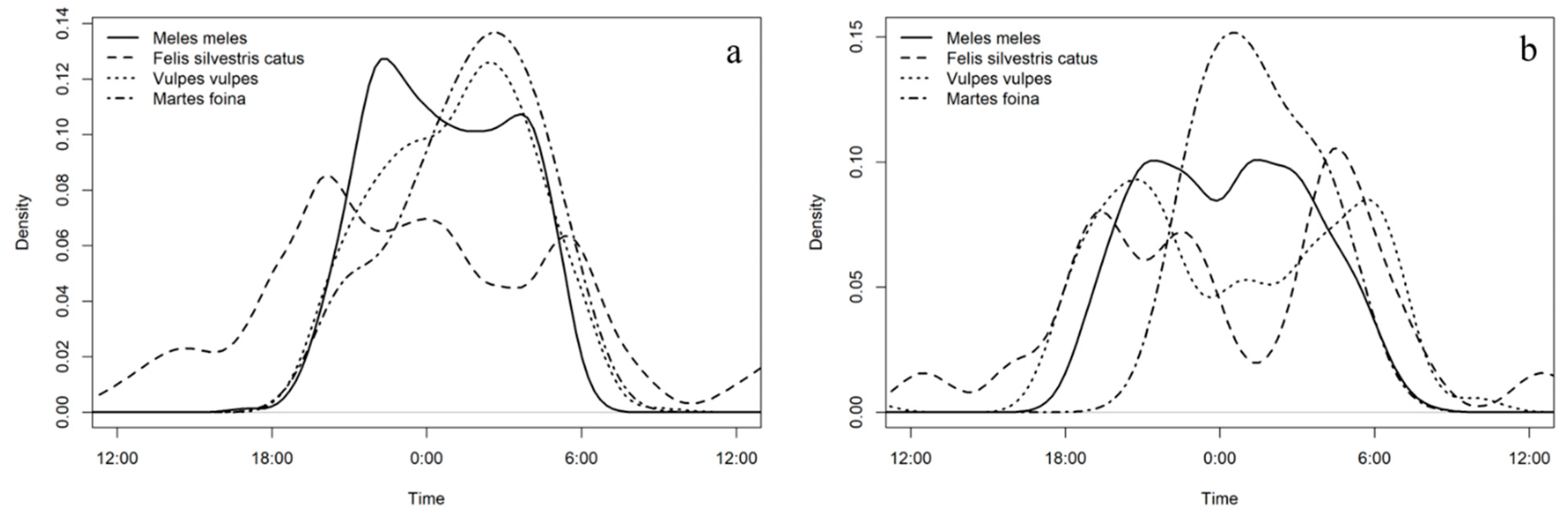 - Monterroso, P.; Alves, P.C.; Ferreras, P. Plasticity in circadian activity patterns of mesocarnivores in Southwestern Europe: Implications for species coexistence. Behav. Ecol. Sociobiol. 2014, 68, 1403–1417. [Google Scholar] [CrossRef]
