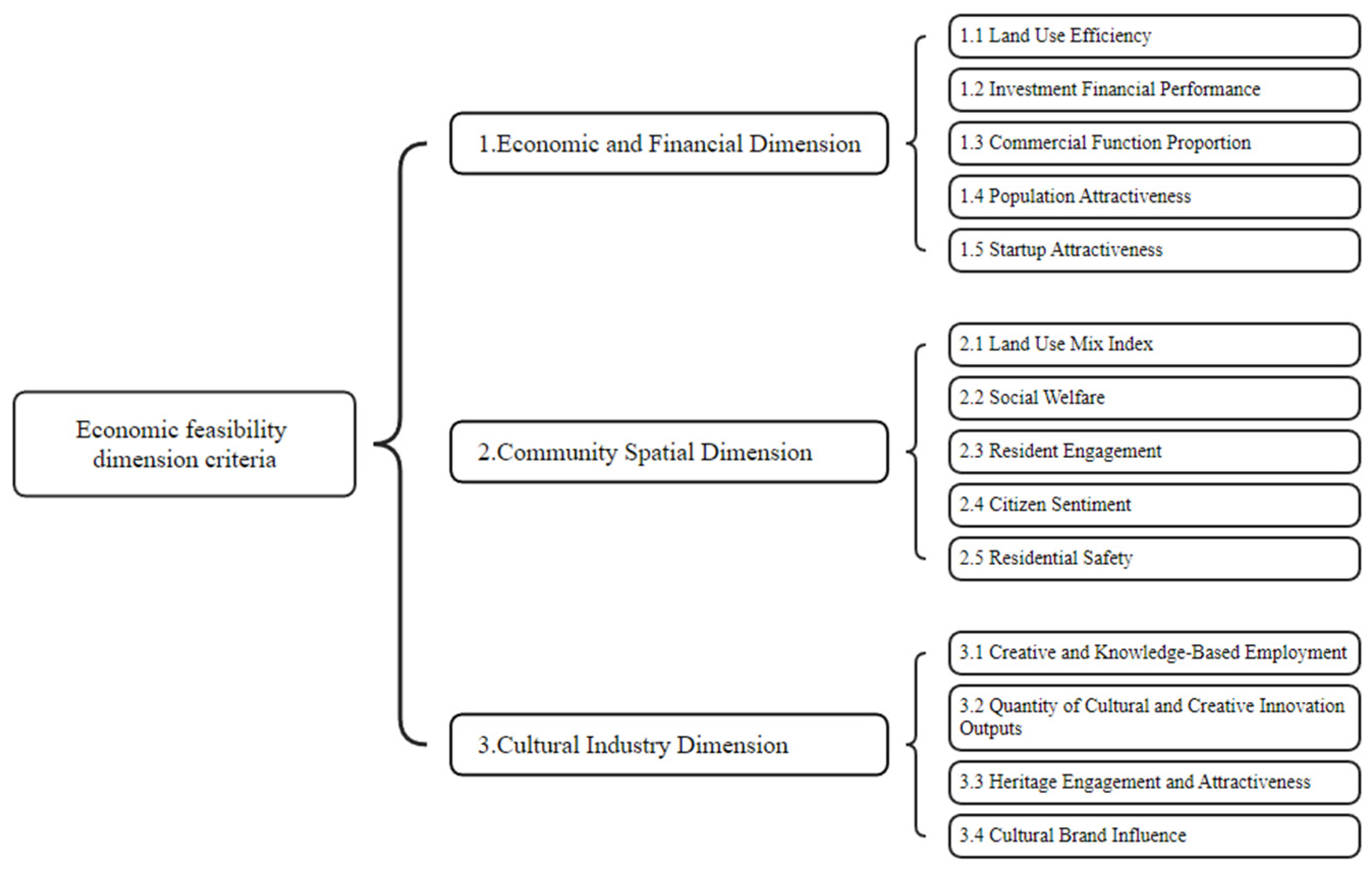 This paper contributes by proposing a decision-making model for the economic viability of adaptive reuse in industrial heritage. Integrating an urban sustainability perspective and grounded in adaptive reuse decision criteria, it translates the concept of “multi-objective negotiation”—emphasizing economic feasibility, social embeddedness, and cultural sustainability through functional transformation within existing spaces—into a measurable three-dimensional evaluation framework [